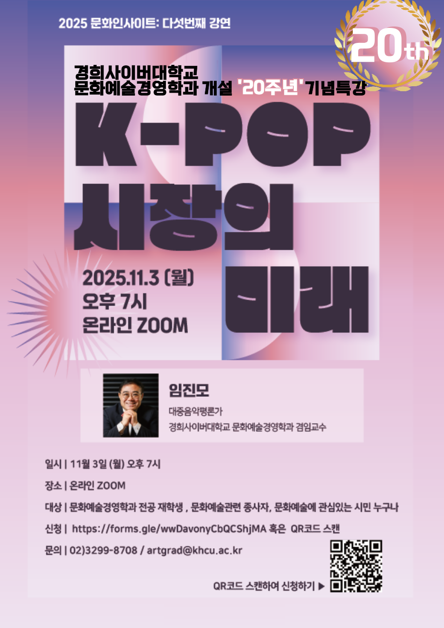 전공 학부, 대학원생, 일반인 종사자, 가수 등 70여명이 참석한 이날 문화인사이트는 KHCU(경희사이버대학교)대학원 문화예술경영 전공에서 마련했다. 문화산업과 예술현장을 깊이 있게 바라보는 전문가와 함께, 변화의 흐름을 함께 읽어보는 온라인 특강이다.