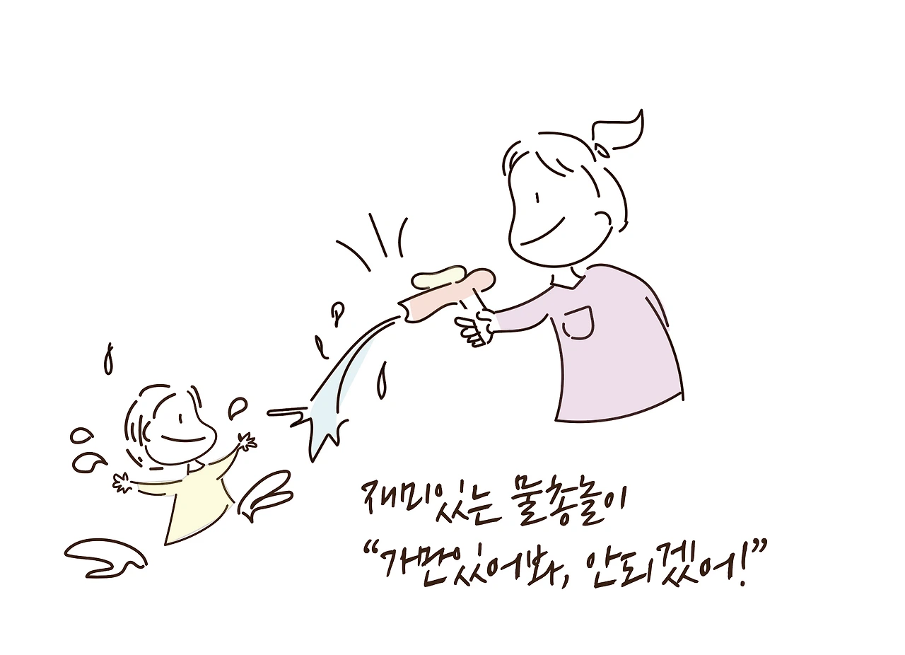 "아아악... 물총이다.."(당황한 연기를 무조건 해줘야 한다. 아이의 놀이에 엄마가 참석해야 하니까..)