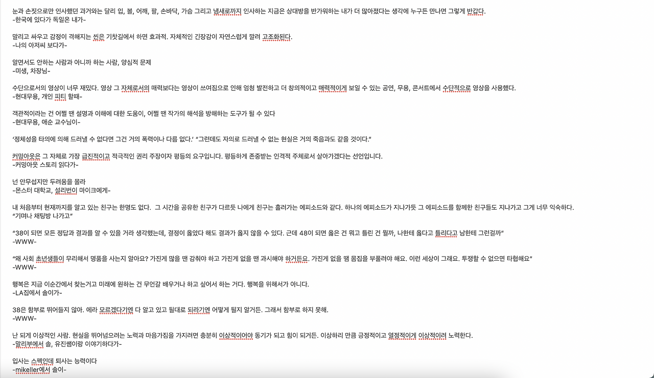 길을 걷다가, 유튜브를 보다가, 회의하다가 심지어는 영화를 보다가도 스스로 울림이 있다면 밖에 나가서까지 메모장을 켜고 적으며 부분적으로 영화를 포기하기도 했다(참고로 필자는 영화관에서 영화를 보는 걸 매우 좋아한다). 그때는 그런 순간들을 마구잡이로 기록하는 것이 올바르고 생산적인 일이라고 생각했다. 그런데 이렇게 마구잡이로 적힌 내 메모장은 이상하게도 술자리에서 자주 회고되었다. 새로운 기록을 하지 않을 땐 단순히 추억을 회상하고 센치해지고 싶은 도구로 사용되었던 것 같다. 그럴 수밖에 없던 것이, 그 메모장의 역할은 ‘기록’이었지 ‘아카이빙’이 아니었기 때문이다.