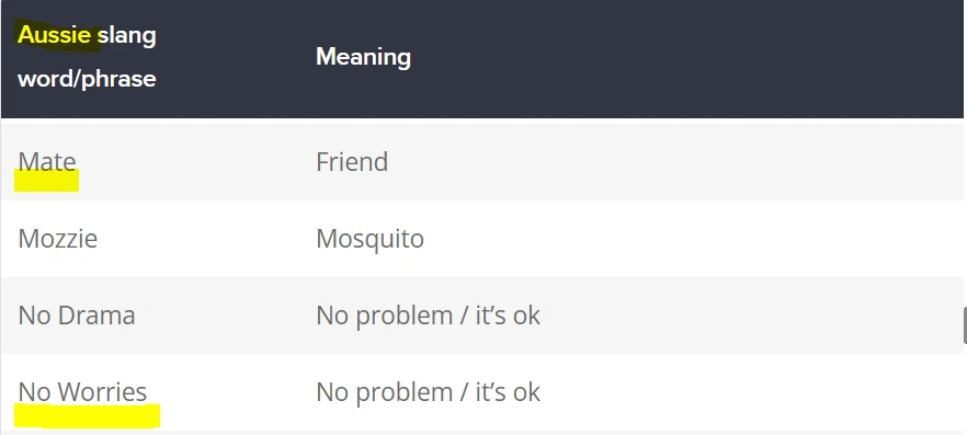 호주인의 말인 Aussie slang [오지 슬랭 / 호주인 속어]을 보면 아래와 같이 풀이가 되어 있다.