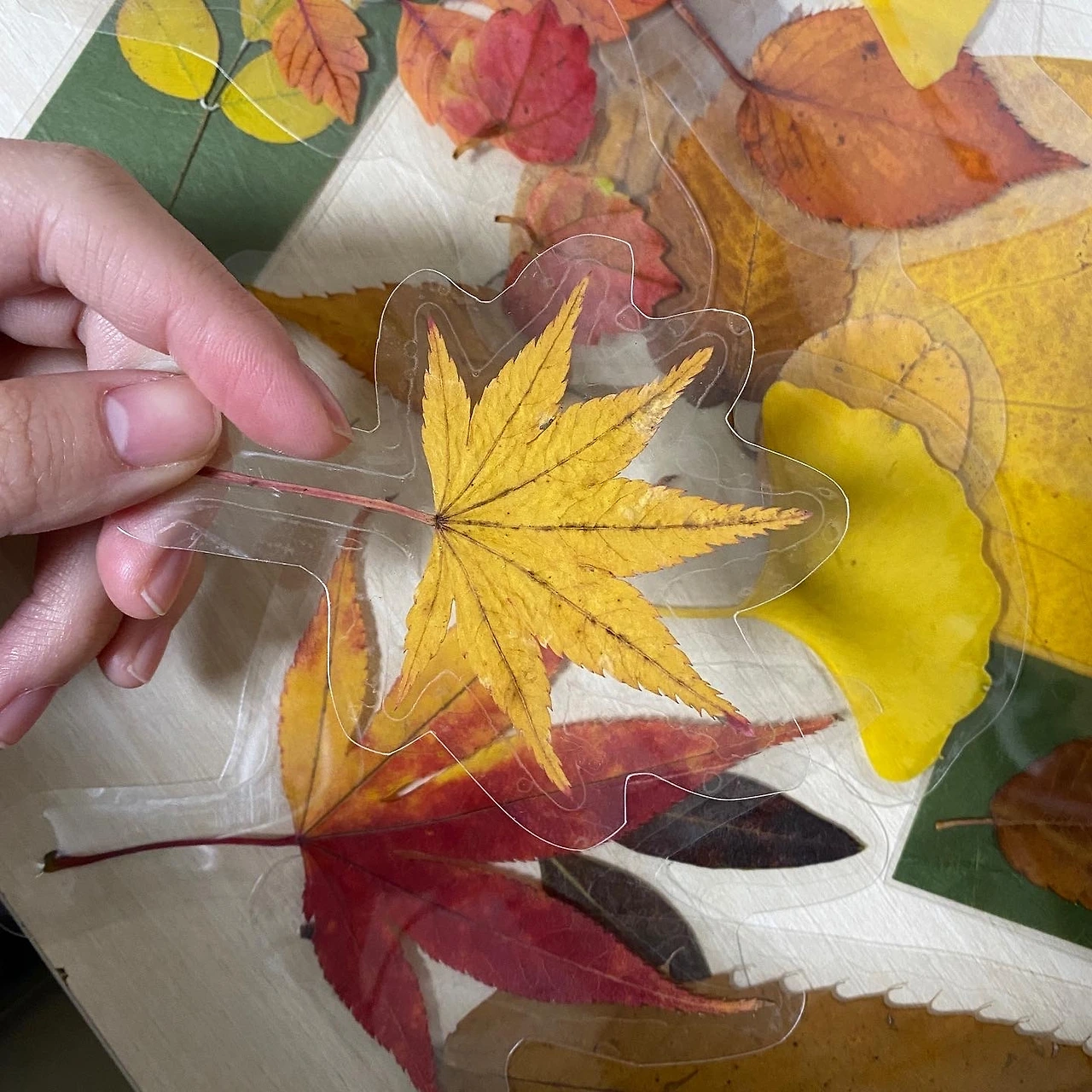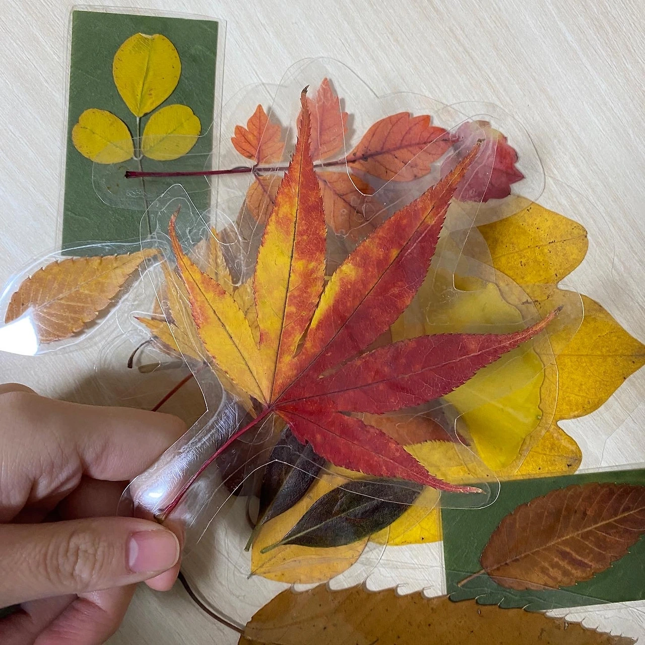 그런 예쁜 낙엽을 주워야 코팅을 하니 세상에 단 하나뿐인 나만의 책갈피 완성...!