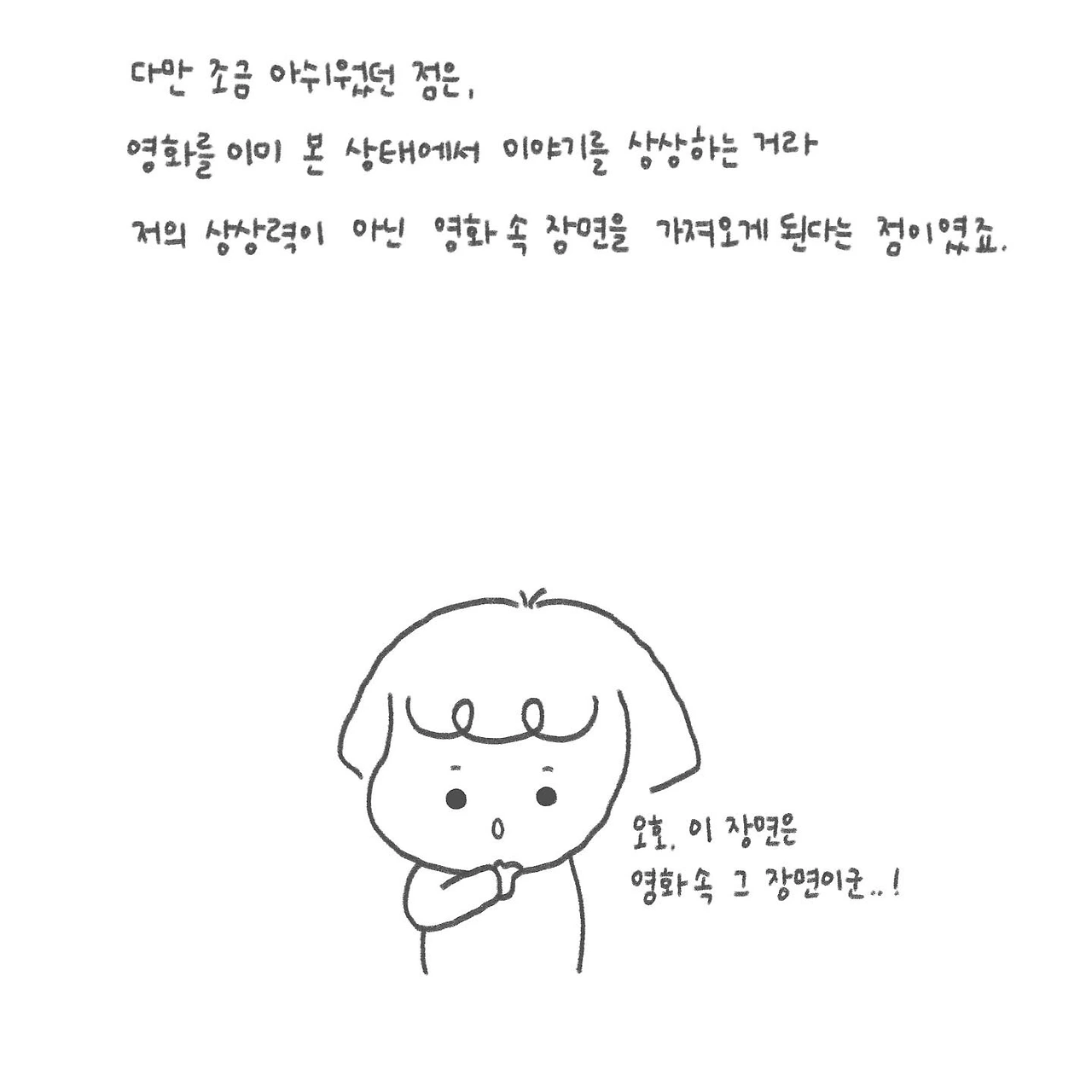 아무튼, 이렇게 책을 재미나게 읽다 보니 아쉬운 점이 있더라고요. 아무래도 영화를 먼저 본터라 저만의 등장인물들을 상상하기란 어려웠고, 배경 또한 영화에서 본 장면들을 갖다 쓴다는 거였어요. 이미 제 머릿속에서 그들과 그곳이 박혀버린 거지요. 상상력을 맘껏 펼칠 수 없는 부분이 조금은 아쉬웠습니다.