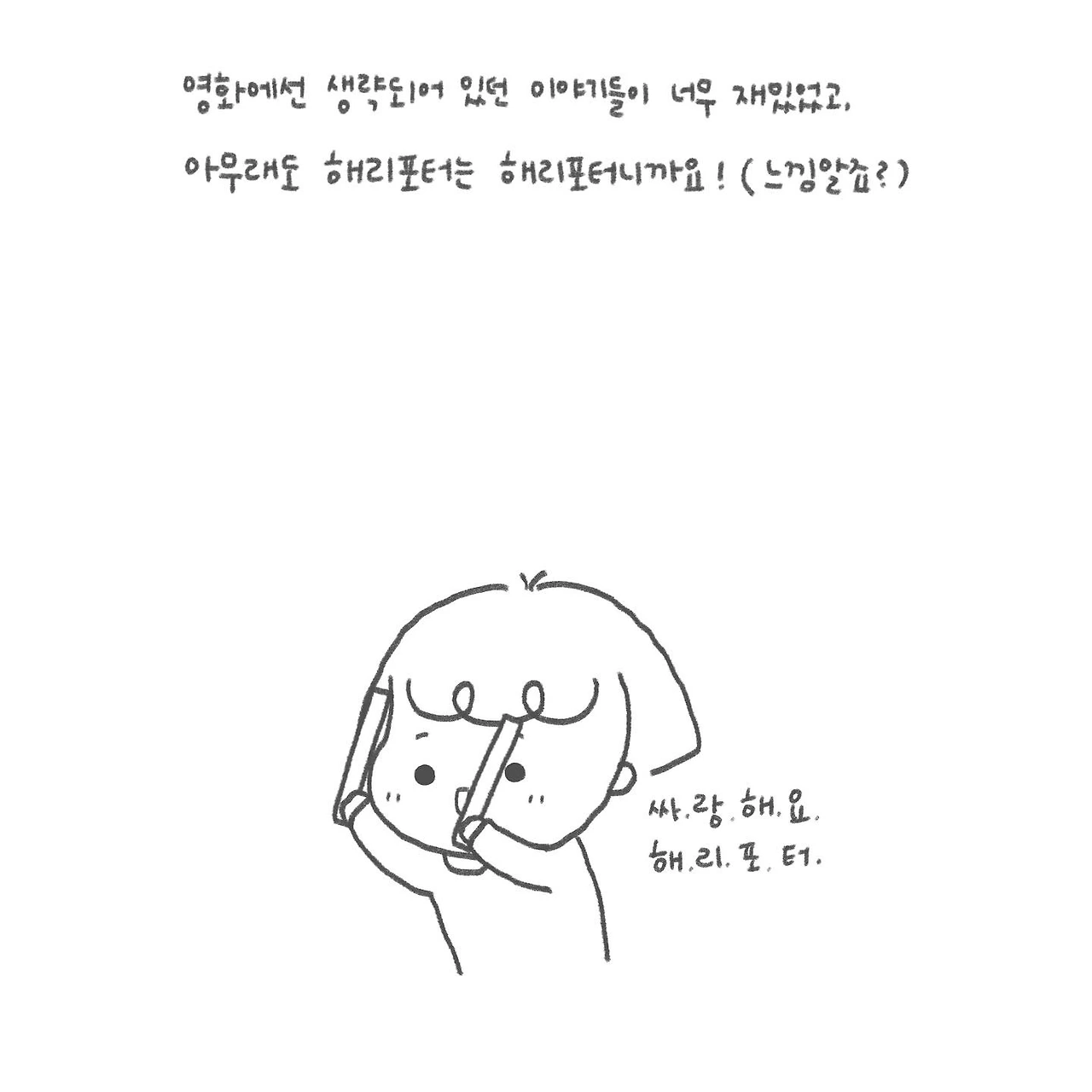 해리포터를 영화로 보고 나니 책으로도 꼭 보고 싶었어요. 나중엔 꼭 해리포터 책을 전집으로 갖겠다고도 생각했었죠. 그런 생각을 가진 제 눈앞에 교보문고에 갔다가 우연히 해리포터 미나리마 에디션 책이 나타났고, 한창 해리포터를 정주행하고 난 뒤라 해리포터에 꽂혀버린 저는 책을 사버렸습니다. (아직까진 두 권밖에 나오지 않았어요)