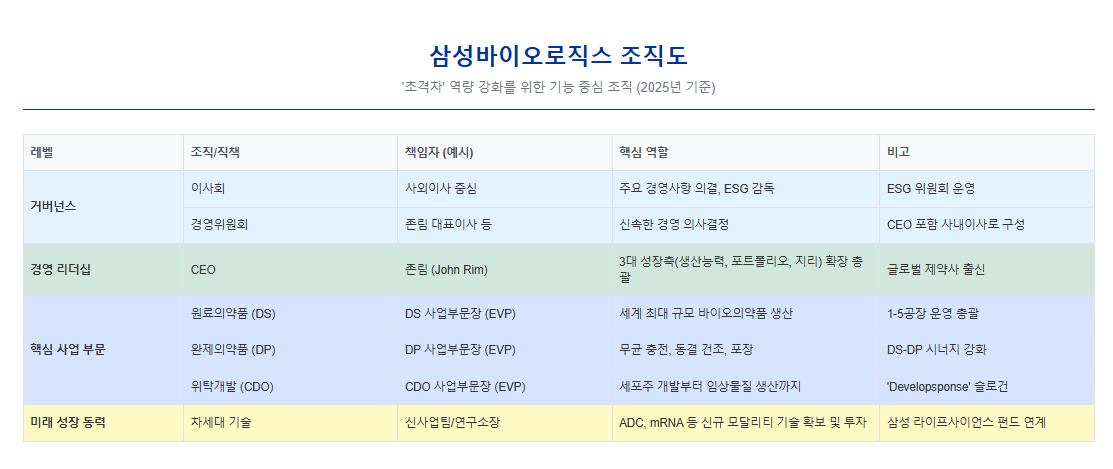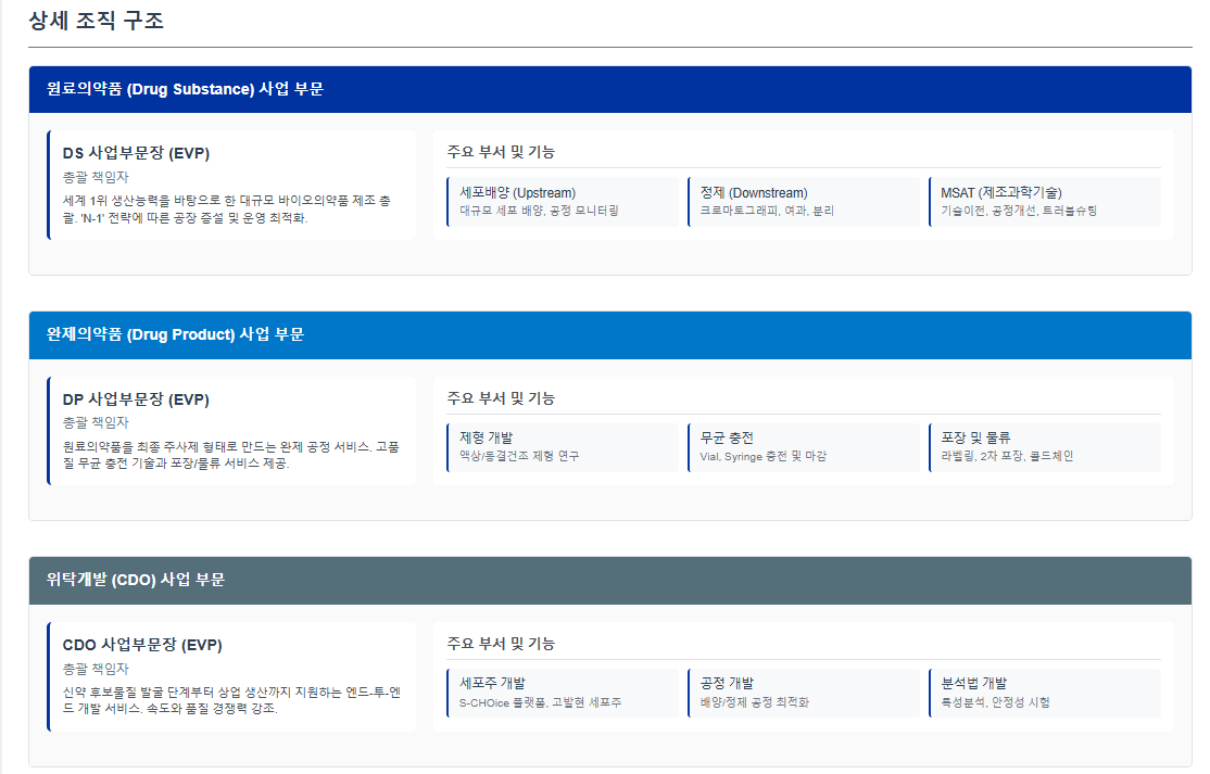 반면 삼성바이오로직스의 전략은 '압도적 효율'입니다. 삼성의 조직도는,