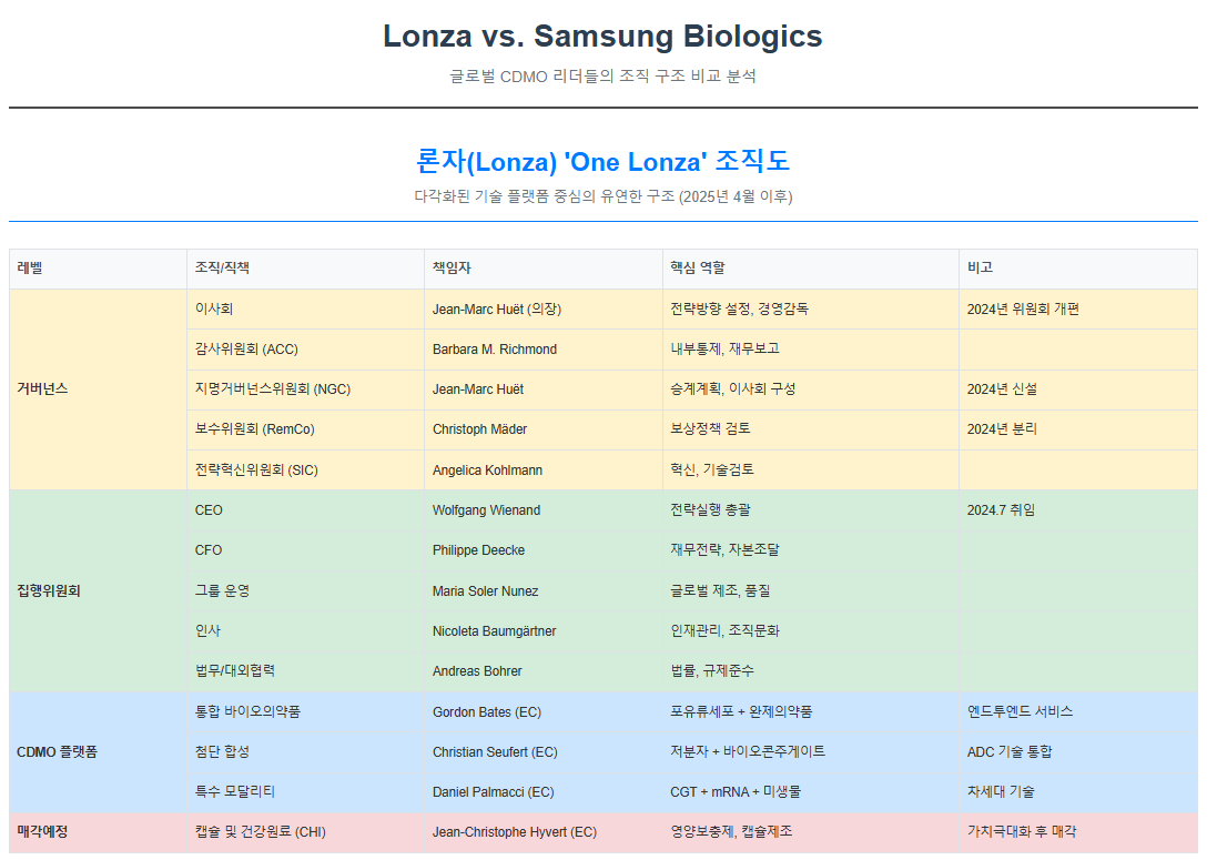결론적으로 론자와 삼성바이오로직스의 조직도는 '다양성을 통한 유연성'과 '집중을 통한 효율성'이라는 두 가지 다른 길을 명확하게 보여줍니다.