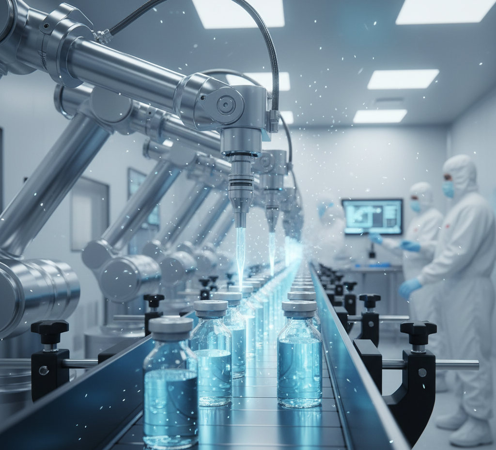 The DS is mixed with protective ingredients called Excipients to keep it stable—a process called Formulation. Then, in the cleanest room you can possibly imagine—a sterile Cleanroom—the liquid is precisely filled into small glass Vials. This is Aseptic Filling, a process where not a single speck of dust or microbe is allowed.