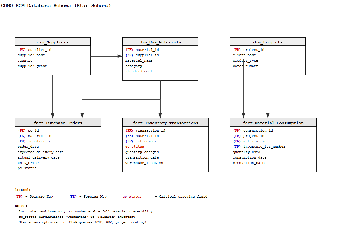 FK (Foreign Key, 외래 키): 다른 테이블의 PK를 참조하는 값입니다. (예: fact_Purchase_Orders 테이블에 있는 material_id는 dim_Raw_Materials의 PK를 참조하는 FK입니다.)