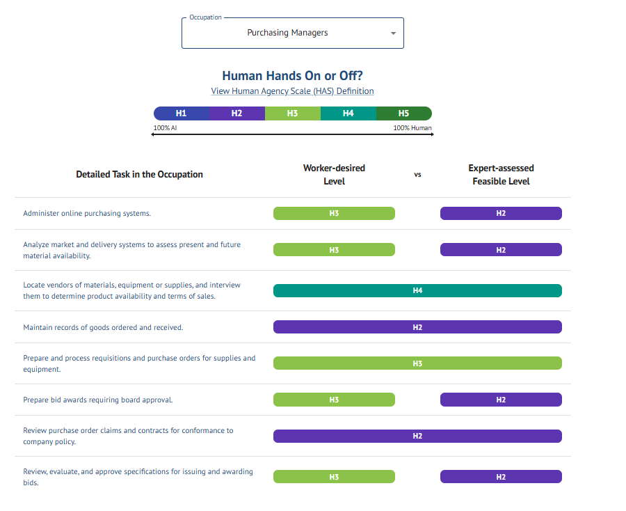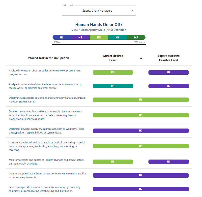 독자 여러분께서도 본인의 직무가 AI에 의해 '자동화'될 영역인지, 아니면 '증강'될 영역인지 직접 확인해 보시길 권합니다. 아래 링크에서 본인의 직업(Occupation)을 검색해보고, 전문가들이 평가한 '인간 행위자 척도(HAS)' 수준과 현업자가 원하는 자동화 수준의 차이를 비교해 볼 수 있습니다.