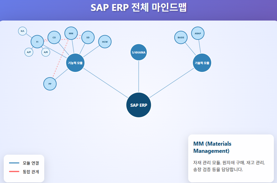하지만 그 어색한 첫 만남은 곧 새로운 여정의 시작이었다. SAP는 단순한 소프트웨어가 아니라, 기업의 모든 프로세스를 하나로 묶어주는 거대한 숲 같은 시스템이었다. SAP의 숲 안에는 모듈이라는 나무들이 있다. 각 모듈은 특정 업무를 책임진다. FI(재무 회계)는 돈의 흐름을 기록하고, MM(자재 관리)는 구매와 재고를 관리한다. SD(판매 및 유통)는 고객 주문을 처리하고, PP(생산 계획)은 공장의 생산 라인을 최적화한다. 이 외에도 HCM(인적 자원 관리), QM(품질 관리), PM(설비 관리) 등 수십 개의 모듈이 서로 얽혀 기업의 심장을 뛸 수 있게 한다.