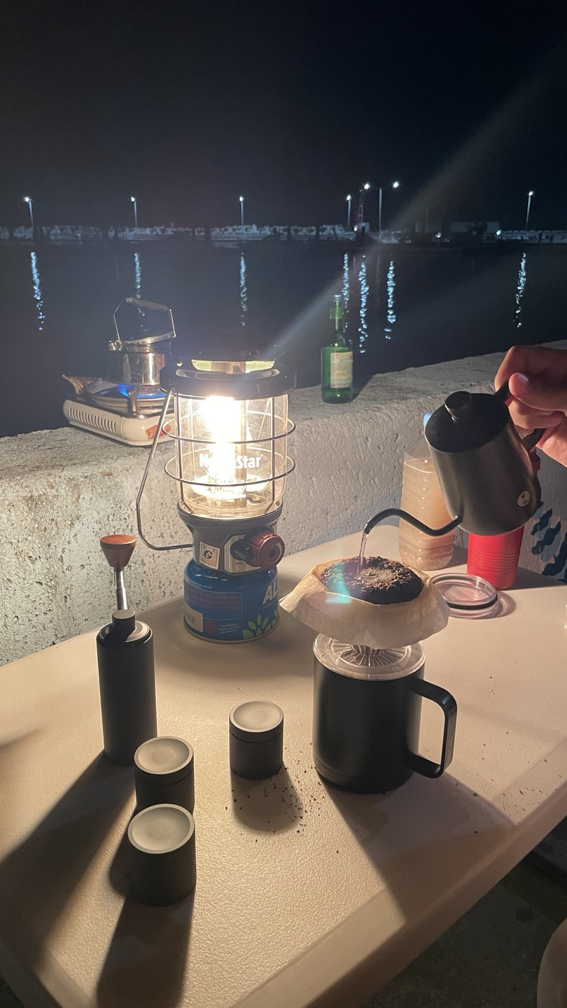바로 한발 아래에서 일렁이는 파도 소리와 마침 보름달이 밝게 비추는 방파제와 어우러진 바다를 바라보며 준비해온 커피 드립 도구들을꺼내서 손으로 돌려가며 그라인딩을하고 갈려진 원두를 드리퍼 필터에 차곡히 쌓고 뜨거운 물을 부으니 바다향과 함께 어우러진 커피향이 사르르 피어오른다. 시원한 바닷바람을 맞으며 드넓게 펼쳐진 밤바다를 바라보며 마시는 커피는 커피의 맛과 더불어 분위기에 취해 더없이 맛있는 커피맛이되었다. 자연속에서 즐기는 야생의 삶을 불편하다는 이유로 거부하던 아내를 꼬신것도 바로 이 한잔의 커피였으니 이맛을 못잊어 다음 여정에도 동참하지 않을까 기대하며 행복에 겨운 커피를 홀짝 거렸다.