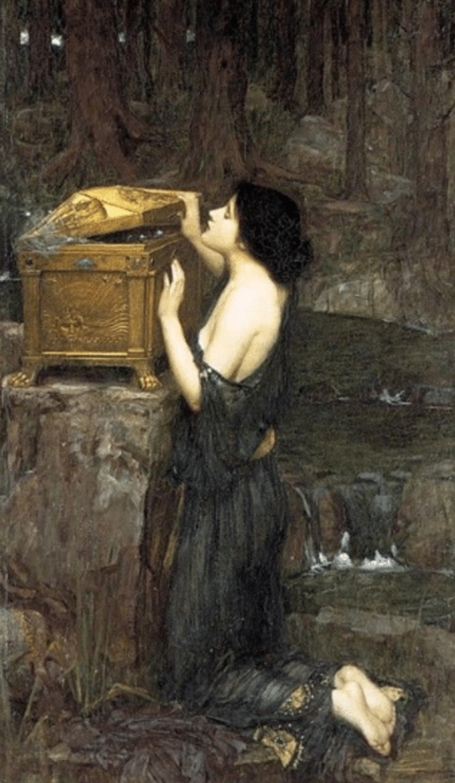 존 윌리엄 워터하우스의 판도라는 모든 재능과 부와 아름다움을 지닌 여인 판도라가 제우스의 선물인 상자를 열어보고 그 속에 가득한 재앙의 씨앗들이 연기처럼 흘러나오는 순간 너무 놀라 다시 상자를 닫는 모습을 그렸다.