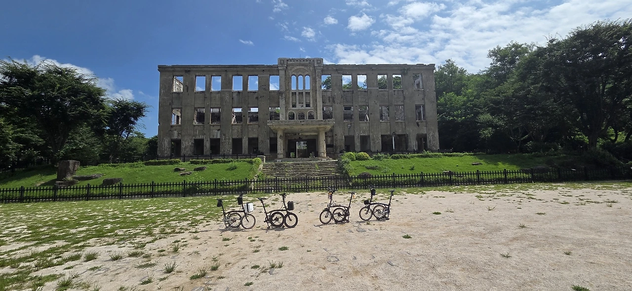 전방 지역답게 길가에는 지뢰 조심 안내판이 군데군데 걸려 있었다. 그 지뢰밭을 곁에 두고 달리는데, 매미소리가 하늘마저 뒤덮을 듯 쩌렁쩌렁 울렸다. 고석정에서 출발한 우리 일행은 직탕폭포와 횃불전망대를 거쳐 노동당사까지 달렸다. 한때 공산당의 본거지였던 그곳, 숱한 인사들이 주검으로 실려 나왔을 그 건물은 이제 세월의 무게에 퇴색해 내려앉아, 그날의 상흔들을 세월 속에 묻어두고 있었다.