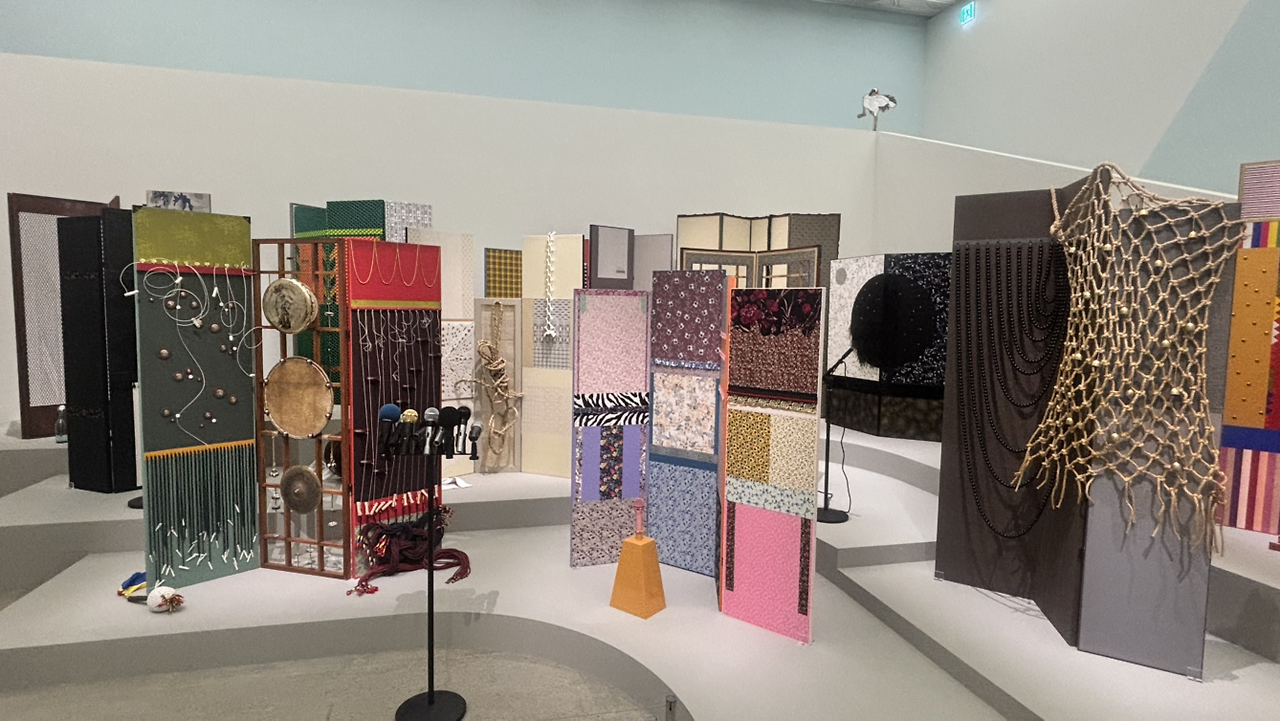 십장생이 그려진 친숙한 병풍. 그런데 그 위에는 마이크, 꽹과리, 장고, 그물망 같은 기기묘묘한 사물들이 얹혀 있었다. 병풍은 한 시대를 살다간 이들의 흔적을 담은 열린 공간처럼 보였다. 힘없는 노인의 지팡이는 주인을 잃은 채 서 있고, 술잔을 기울이며 노래 부르던 취객은 빈 소주병만 남기고 사라졌다. 정성스럽게 수놓인 자취와 뜻모를 한자, 그 모든 것들은 굿판 같은 삶의 현장이었다. 과거와 현재가 연결되고, 그 속에서 나는 언젠가 사라질 미래의 나 자신을 마주했다.