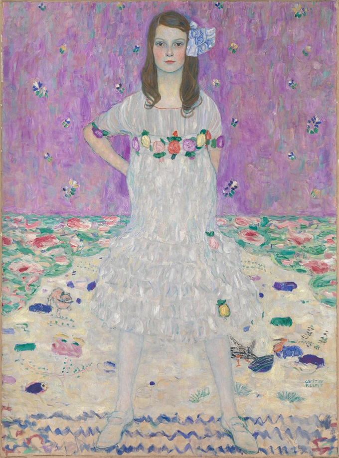 구스타프 클림트의 《마다 프리마베시 초상》은 1912년경 그려진 작품으로, 비엔나의 부유한 가문 프리마베시 집안의 소녀 마다를 그린 초상화다. 화면 가득 꽃무늬와 장식적 패턴이 휘감고 있지만, 그 중심에 선 소녀는 장식에 묻히지 않는다. 두 손을 허리에 얹고 정면을 응시하는 당당한 자세는, 단순한 아동 초상에 머물지 않고 한 인격체로서의 힘과 가능성을 드러낸다.