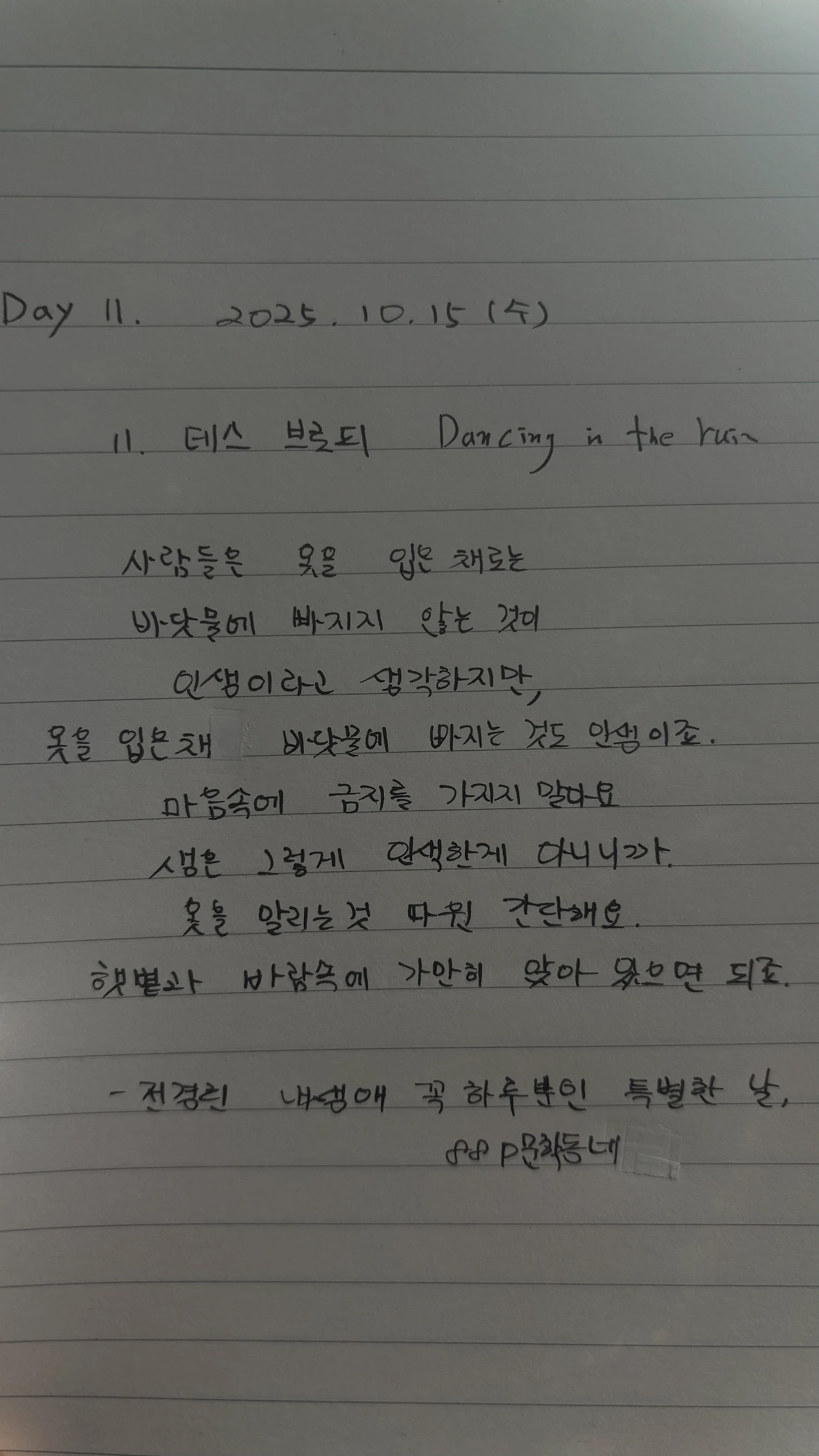 빗속에서도 움츠러들지 않고, 오히려 장난스럽게 발을 맞추며 즐기는 인물들의 모습은