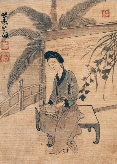 전통 복식의 흐르는 주름, 단정한 상투머리, 그리고 정제된 몸짓이 그녀의 단아함을 돋보이게 한다. 그림은 마치 “책을 읽는 순간, 세상과의 문이 잠시 닫힌다”는 것을 조용히 말하는 듯하다.