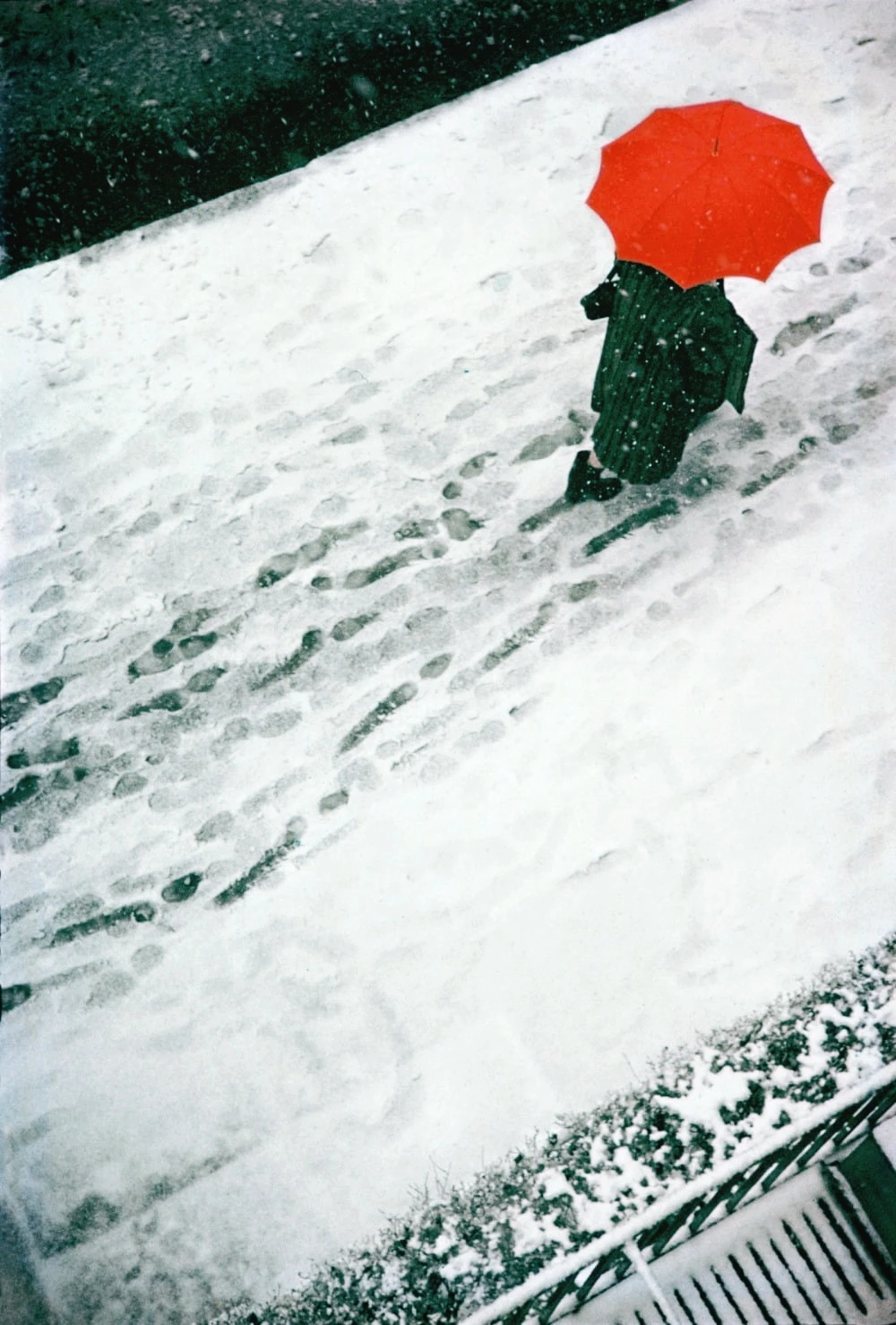검은 외투의 인물과 유독 선명한 붉은 우산이 대비를 이룬다.