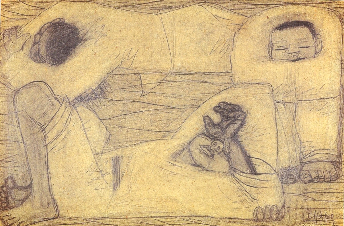 이 그림 속 세 인물은 서로 가까이 누워 있지만, 각자의 세계에 잠겨 있다. 몸은 맞닿아 있으나 시선과 감정은 분리된 채, 묘한 거리감이 흐른다. 거칠고 단순한 선으로 그려진 인물들은 완결되지 않은 존재처럼 보이며, 그 불완전함이 오히려 인간다움을 강하게 드러낸다.