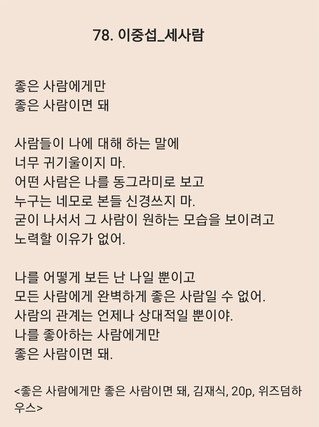 결국 나 역시 그 무수한 군상들 속 한 사람에 지나지 않는다. 그럼에도 타인을 향해 동병상련의 마음이 드는 건, 우리가 겉모습만 다를 뿐 삶이라는 고단한 항해를 함께 건너는 동료이기 때문일 것이다. 내가 그들의 안녕을 빌었듯, 이름 모를 누군가도 나의 고단한 어깨를 보며 조용히 안녕을 빌어주기를.