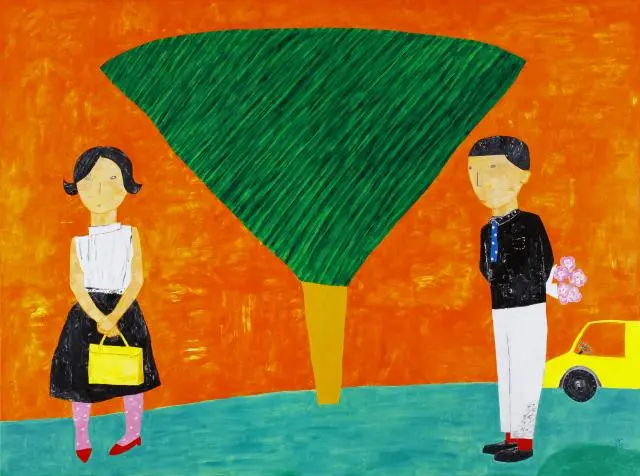 화면 한가운데 크게 자리한 초록의 나무는 두 인물을 갈라놓는 동시에 이어주는 존재처럼 서 있다. 왼편의 여인은 조심스럽게 가방을 움켜쥔 채 서 있고, 오른편의 남자는 꽃을 숨긴 손으로 한 발짝 떨어져 있다. 둘 사이의 거리는 짧지만, 그 간극에는 말로 다 하지 못한 망설임과 설렘이 겹겹이 쌓여 있다.