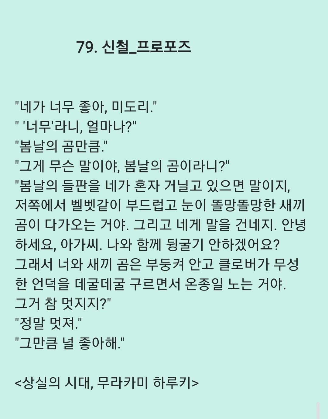 나는 화려한 말보다 사소한 행동 하나에 스며 있는 진심을 믿는다. 끝없는 배려로 증명되는 마음이야말로 사랑이며, 그 마음을 상대가 알아봐 줄 때 사랑은 비로소 찬란하게 빛난다고 믿기 때문이다.