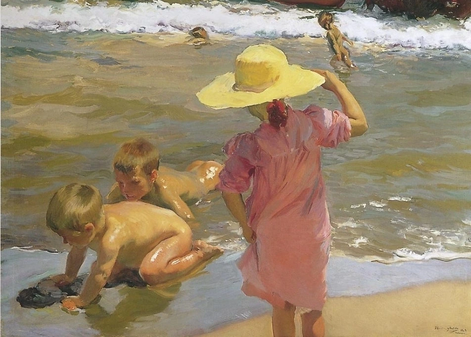 〈바닷가의 아이들〉은 소로야 특유의 빛의 감각이 가장 잘 드러나는 작품 중 하나다. 햇빛을 머금은 바닷물 위에서 아이들은 아무런 경계도 없이 몸을 낮추고, 물과 모래를 만지며 놀이에 몰입해 있다. 아이들의 피부 위로 반사되는 빛, 물결에 의해 일그러지는 몸의 윤곽, 순간적으로 스쳐 지나가는 파도의 움직임이 자유로운 붓질로 포착되어 있다.