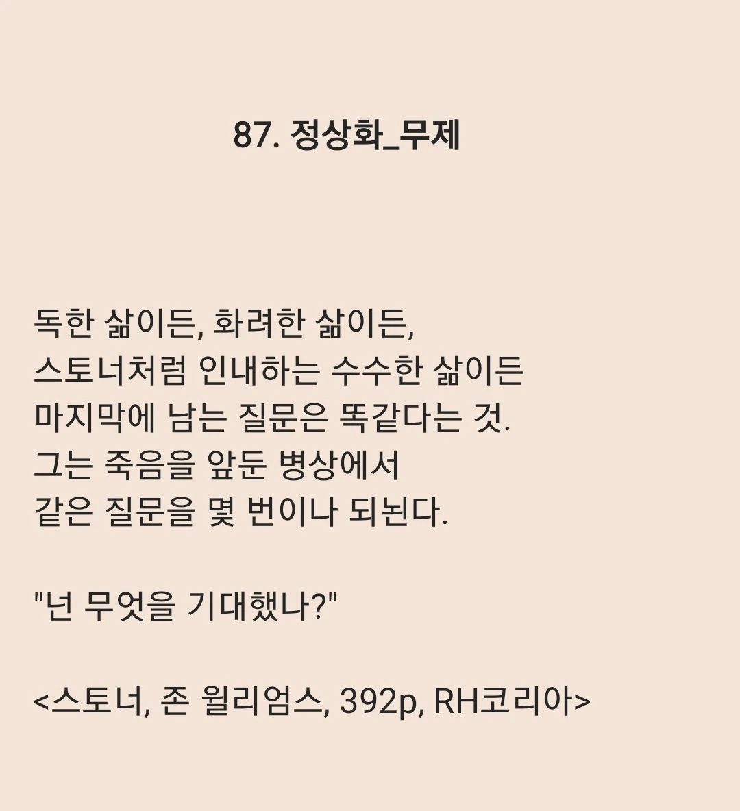 회색빛 캔버스 위에 남겨진 수많은 추억의 단편들, 삶의 결들이 고스란히 배어든 그림 한 점 앞에서 나는 지나온 궤적을 돌아본다. 존 윌리엄스의 소설 『스토너』 속 주인공이 죽음을 앞둔 병상에서 스스로에게 되물었던 질문을 나에게도 던져본다.