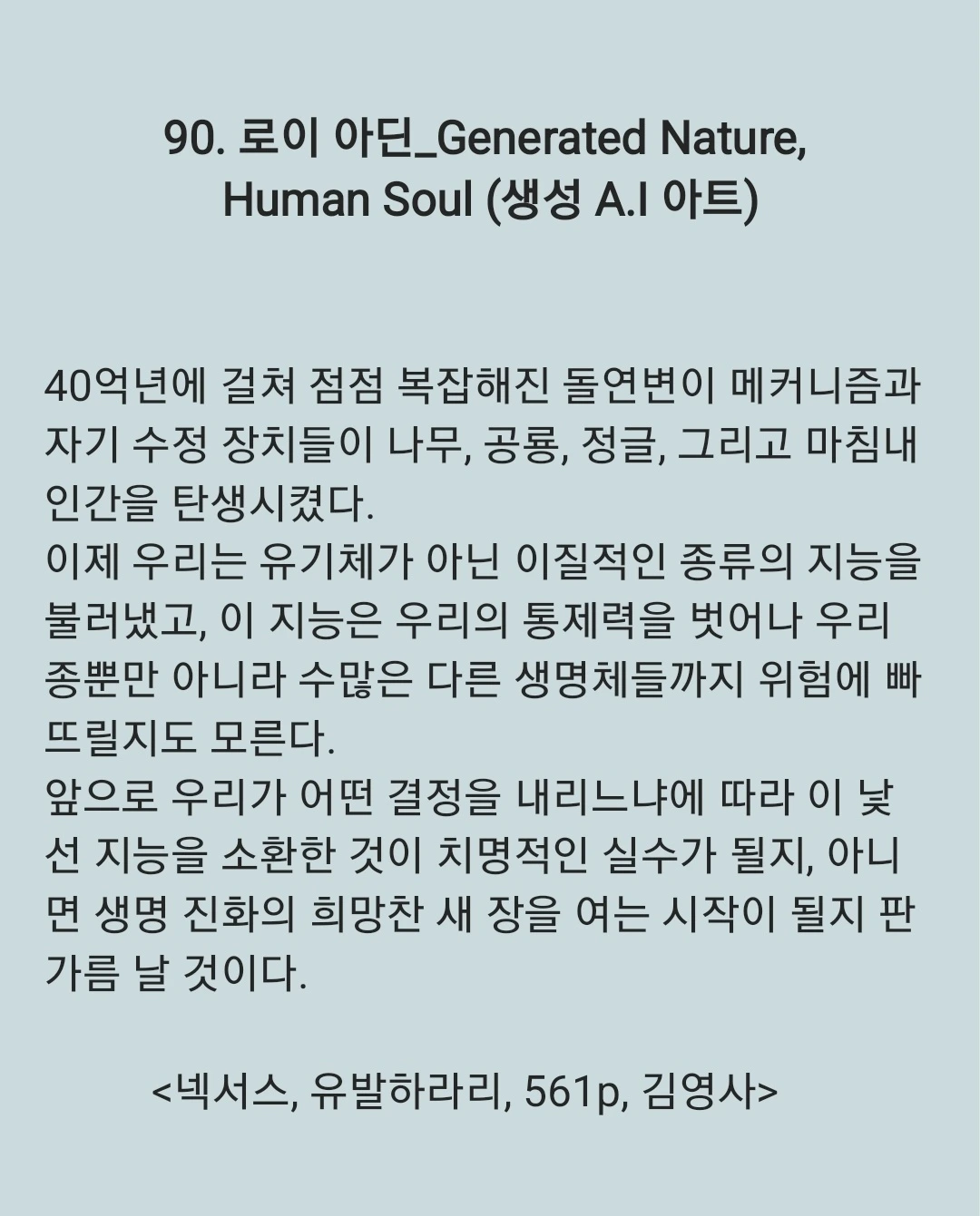 작가는 이를 통해 생성 AI가 새로운 ‘종(種)’의 가능성으로 등장한 현시점을 조명하며, 인간 중심적 세계관과 생명 개념에 대한 재고를 제안한다.