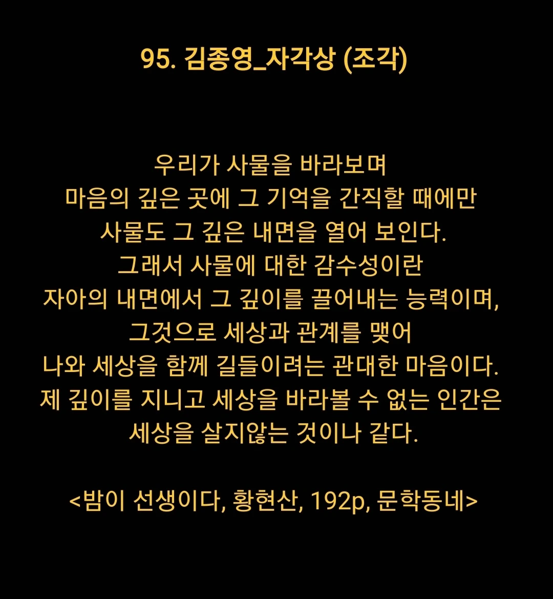 언젠가 더 많은 계절을 건너 백발의 노인이 되었을 때, 삶을 향한 애정과 절제된 시선이 고요히 깃든 얼굴을 갖고 싶다. 함부로 재단하지 않고, 쉽게 외면하지 않으며, 오래 바라보는 법을 익힌 흔적이 내 삶의 마지막 ‘자각상’이 되기를 바란다. 그렇게 나의 얼굴도, 나의 삶도 조금씩, 그러나 분명히 아름답게 조각되어 가기를 조용히 염원해 본다.