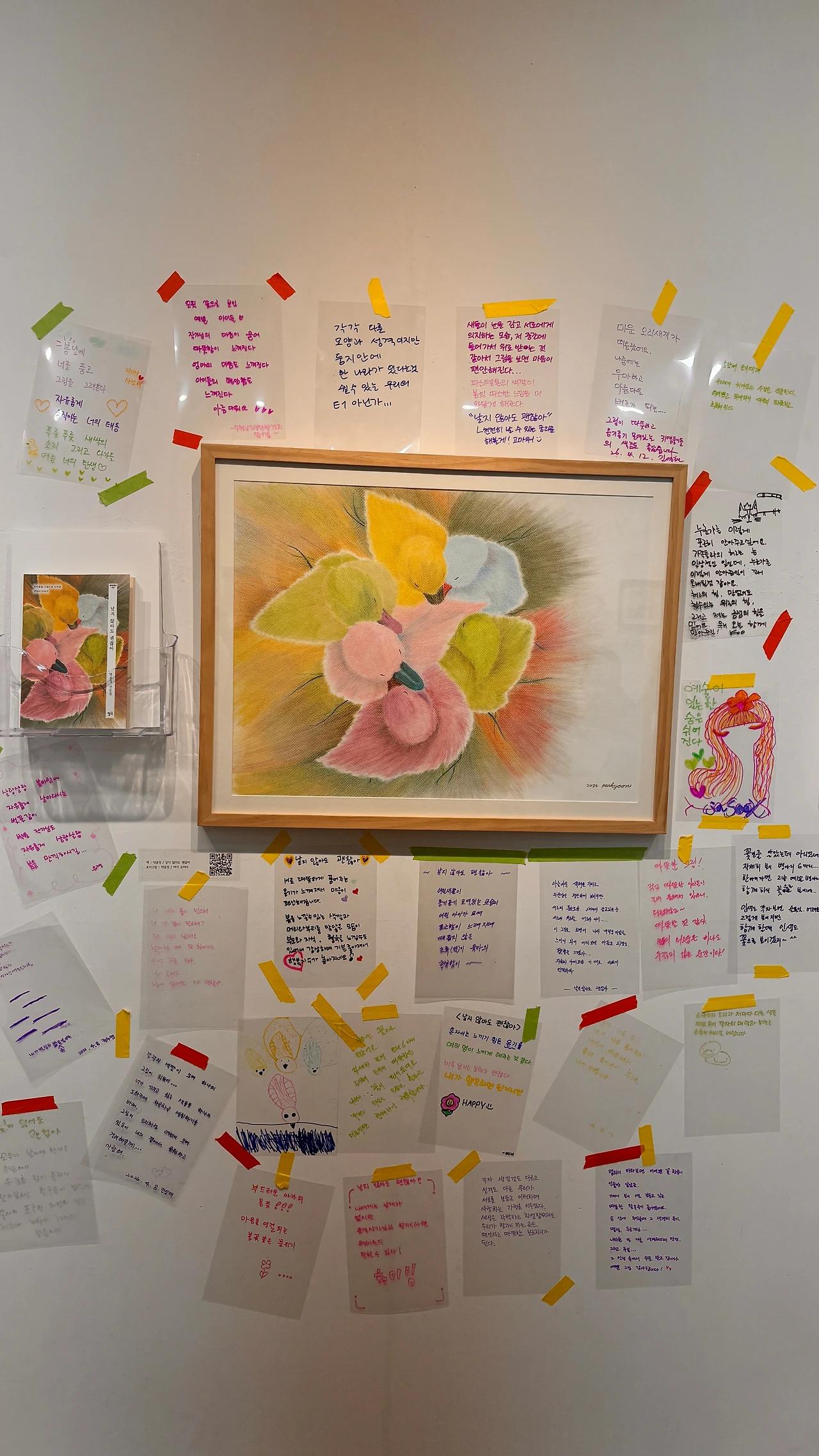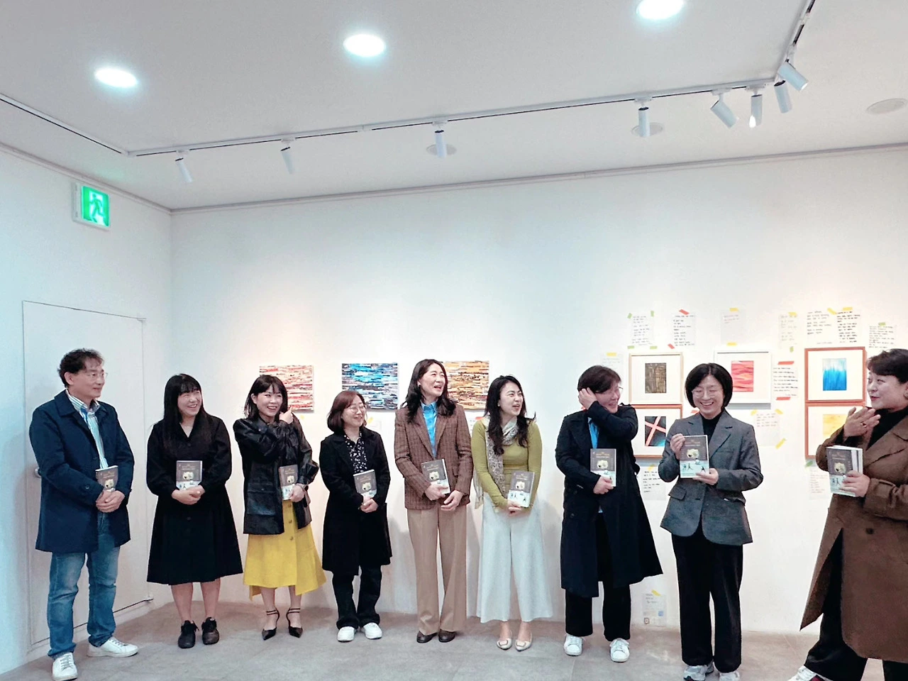 어제에 이어 오늘도 많은 분이 걸음을 해주셨다. 갤러리 B의 벽면, 전시된 그림과 책 곁에는 관람객들이 남긴 감상문들이 하나둘 꽃처럼 피어 있었다. 가만히 헤아려보니 어느덧 140편의 이야기가 벽을 가득 채우고 있었다. 서로 다른 색을 지닌 마음들이 글이라는 옷을 입고 나란히 놓인 모습은 그 자체로 이미 하나의 거대한 풍경이었다.