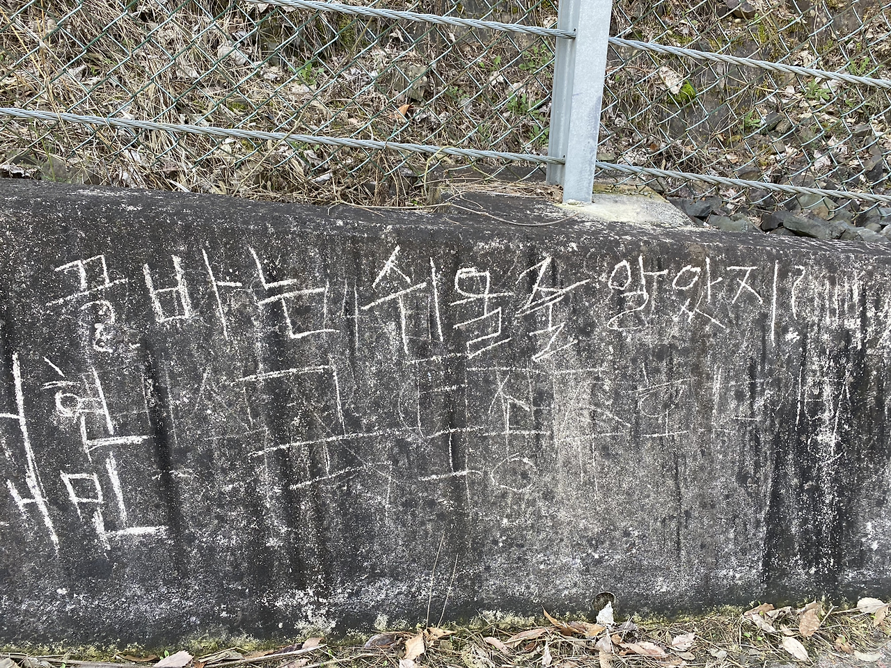 이화령보다 경사가 심하여 모두 끌바를 할 수밖에 없었다. 그래도 길 양쪽에 가득 찬 낙서들을 하나씩 읽어보면서 가는 길은 지루하진 않았다.