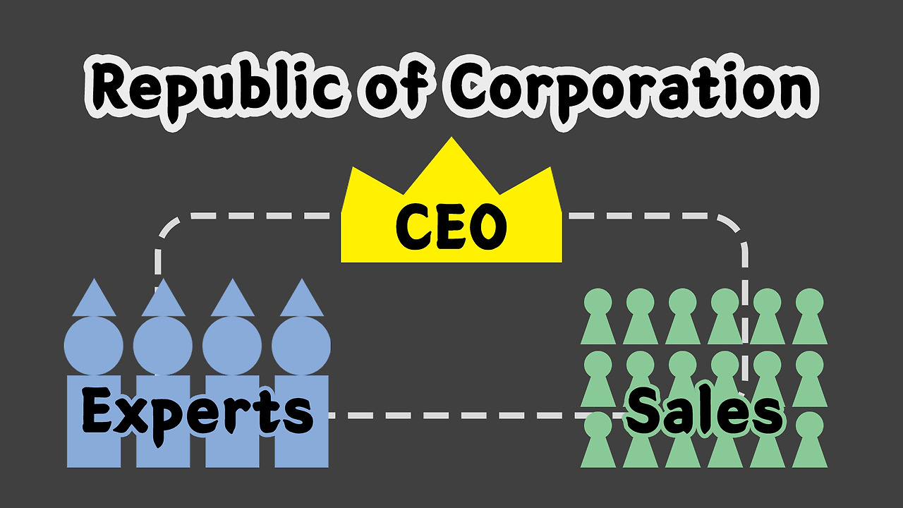 결국 현대 기업은 CEO, 전문가 집단, 그리고 세일즈 집단을 모두 포함하고 있으며, 이는 현대 공화정의 3권 분립(행정부, 사법부, 입법부)과 매우 흡사하다. 이러한 구조를 통해 기업은 다각적인 기능을 수행하며, 각 기능이 서로 보완하면서 기업 전체의 성장을 도모한다.