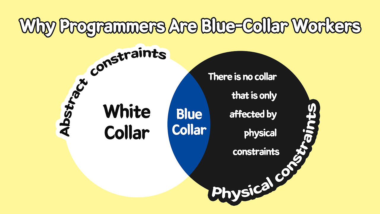 간혹 블루칼라는 추상 규제(정책, 법적규제, 설계 등)에 따르지 않아도 된다고 생각하는데 조금만 숙련된 블루칼라 노동자라면 추상 규제도 반드시 따라야 한다. 예를 들어 숙련된 건설 목수는 지자체의 규제와 법률에 따라서 나무의 가공 및 건축 자재를 알맞게 선별하고 시공해야 한다. 개발자는 물리적 제약을 다루고 고도의 기술적 숙련을 필요로 하며 추상적 문제 해결 능력을 요구하는 직업이다. 이러한 특성들은 개발자를 블루칼라 집합에 포함시킨다.