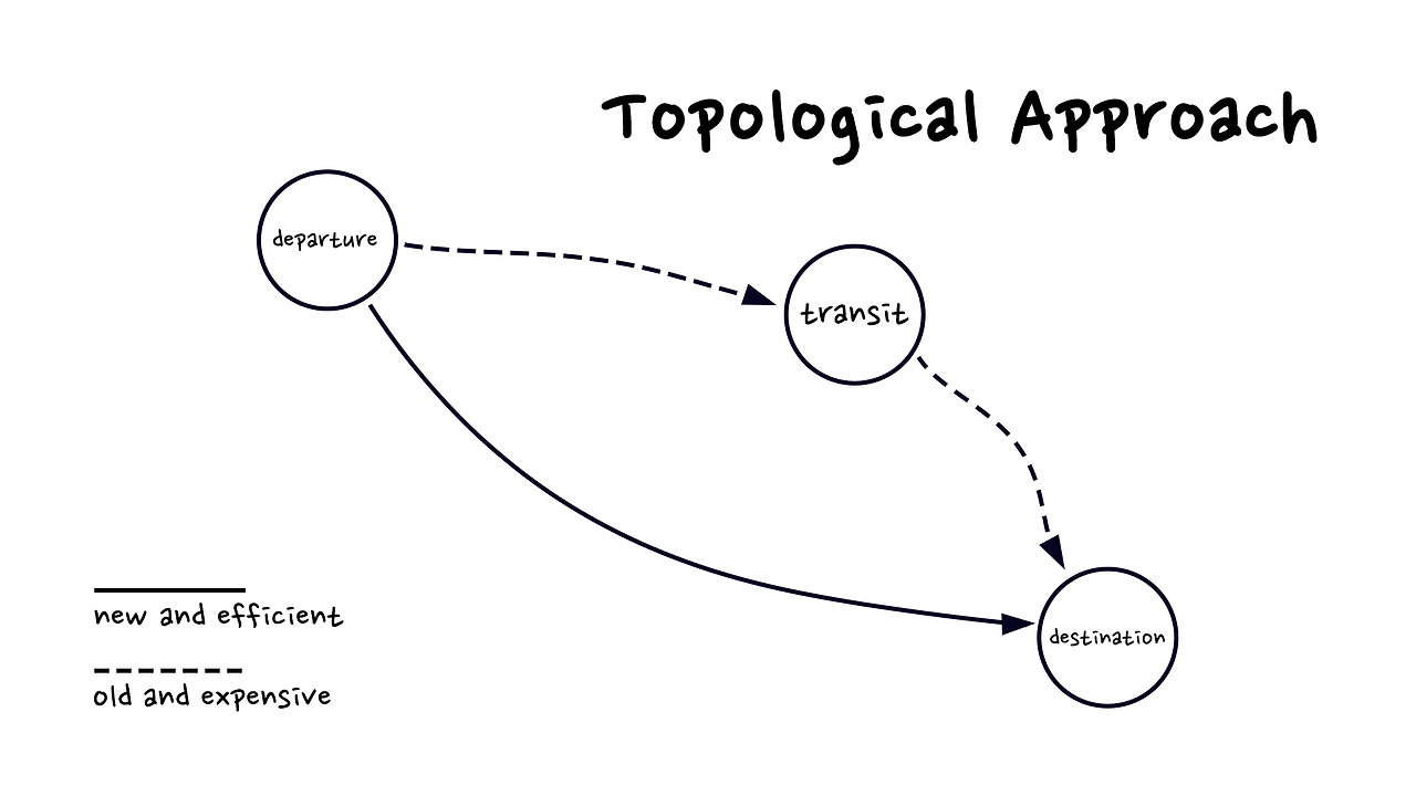 위상적 접근의 방법은 크게 세 가지 단계로 나뉜다: 시각화, 단순화, 그리고 새로운 경로 설계이다. 첫 단계는 시각화이다. 비즈니스 시스템을 그래프로 모델링하여, 모든 노드(예: 고객, 부서, 파트너)와 에지(연결 경로)를 시각적으로 표현한다. 두 번째 단계는 단순화이다. 이 과정에서는 중요한 노드를 제외하고 비효율적인 주변 노드를 제거한다. 단순화된 모델은 문제를 극명하게 드러내어 준다. 세 번째 단계는 새로운 경로 설계이다. 새로운 경로를 만드는 방법에는 두 가지가 있다: 기존에 없던 노드를 추가하거나, 불필요한 노드를 제거하는 것이다. 새로운 노드를 추가하면 부족한 연결을 보완하거나, 예상하지 못한 지름길을 만들 수도 있다. 불필요한 노드를 제거한다면 비효율적 연결이나 비용이 높은 노드를 제거할 수 있다. 이를 통해 새로운 경로를 만들어 기존 네트워크와 본질적으로 다른 연결 구조를 만들어낸다. 이 과정은 단순한 효율성 개선을 넘어 차별화된, 위상적으로 다른 비즈니스 모델을 제시할 수 있다.