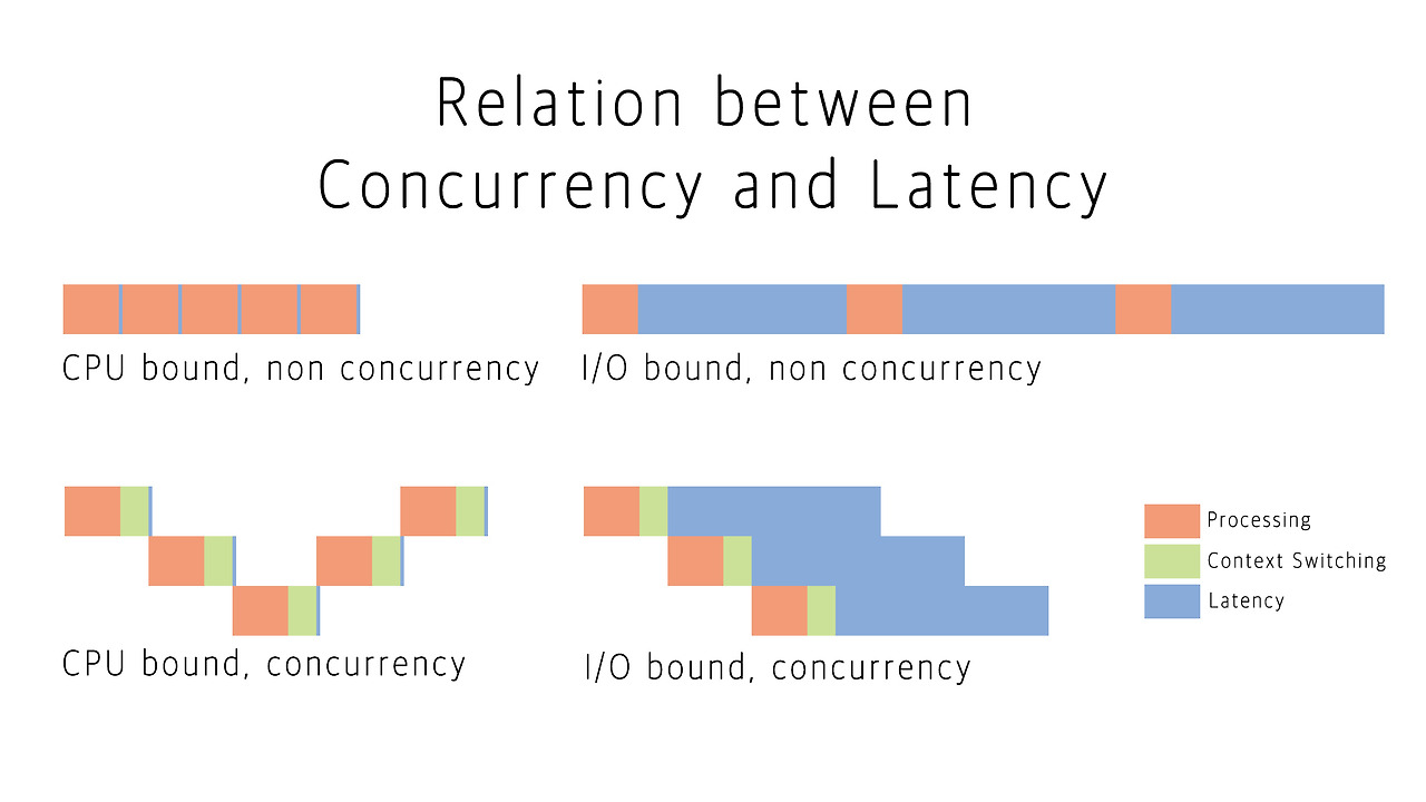 I/O 바운드 작업은 대기 시간이 많아 CPU가 놀게 되는 반면, CPU 바운드 작업은 연산이 주를 이루며 대기 시간이 거의 없다. 때문에 동시성은 주로 대기 시간이 많은 I/O 바운드 작업에서 빛을 발한다. 반면, 대기 시간이 적고 계산 시간이 많은 CPU 바운드 작업에서는 동시성이 큰 의미를 갖지 못하며, 오히려 병렬성(멀티코어 활용)이 중요해진다. 따라서 작업의 성격에 따라 동시성과 병렬성을 구분하고 적절히 적용하는 것이 매우 중요하다.