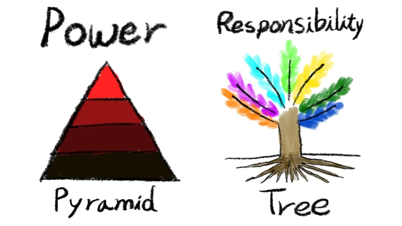 처음에 권력의 크기를 기준으로 작성한 조직도를 피라미드형이라고 서술했다. 그렇다면 책임을 기준으로 작성한 조직도는 어떤 형태로 묘사하면 좋을까? 본인은 나무형이라고 생각한다. 뿌리는 아래로 단단히 버티고 곧게 뻗어나가 나뭇잎이 활짝 펼쳐나가는 모습이 책임을 기준으로 작성한 조직도에 어울리는 그림인 것 같다.