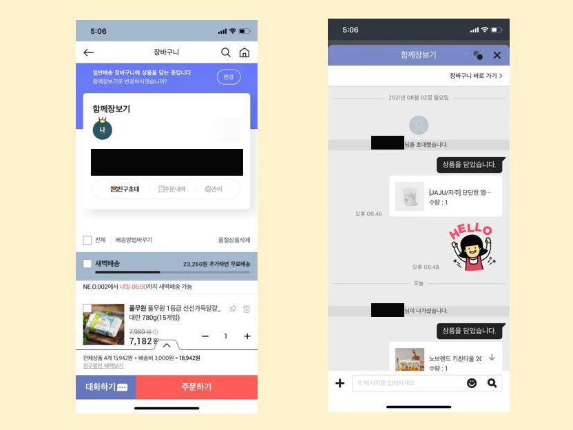 함께 장보기 서비스는 장바구니 화면에서 확인할 수 있다. 채팅방처럼 장바구니 채널명을 설정하고 함께할 친구에게 메신저로 접속 코드를 발급(혹은 발급 없이)하면 함께 장바구니를 채울 수 있다. 그리고 대화하기 기능을 통해 누가 어떤 상품을 담았는지 확인할 수 있고 이모티콘이나 상품에 대한 평가를 주고받을 수 있다.