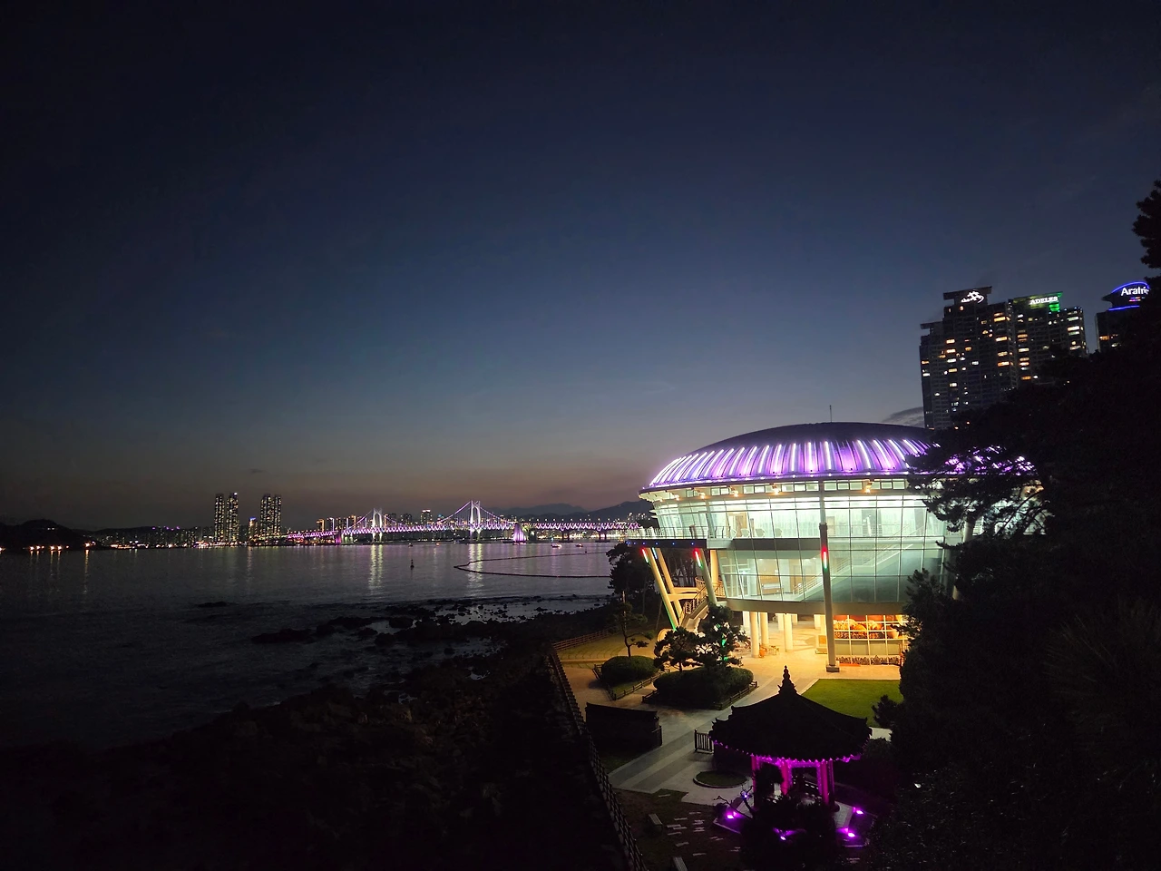 2005년 부산 APEC 정상회의가 개최된 동백섬 누리 마루가 올해 경주 APEaC 정상회의 때문에 혹시 야간 조명을 켜 놓았나 모르겠다. 저멀리 광안대교가 보인다.