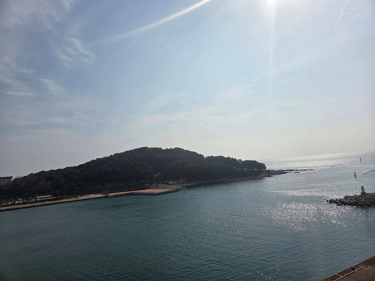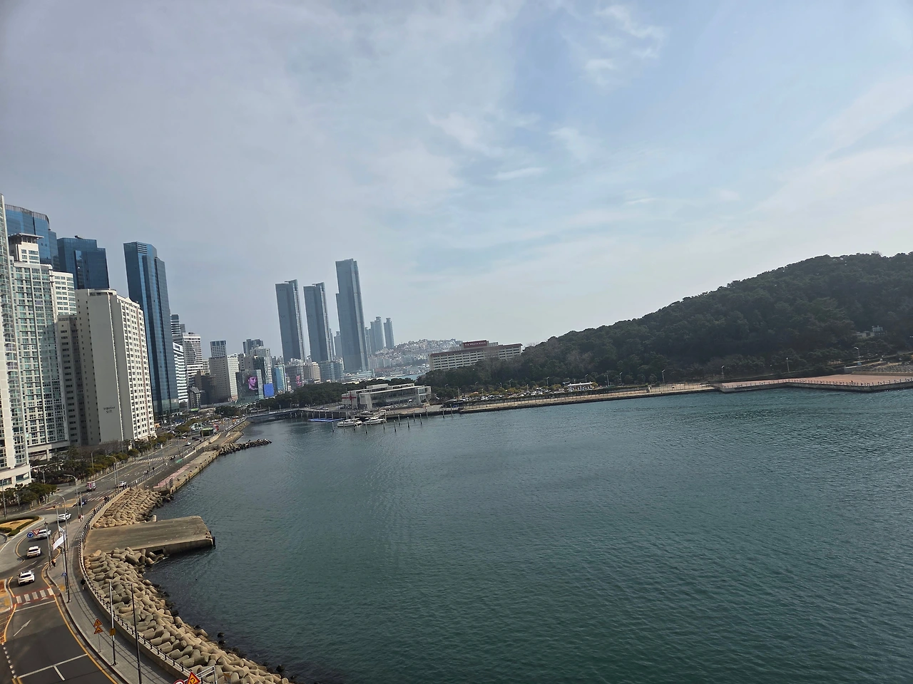 주말 아침, 해운대 바다와 동백섬이 보이는 카페에 앉아 있다.