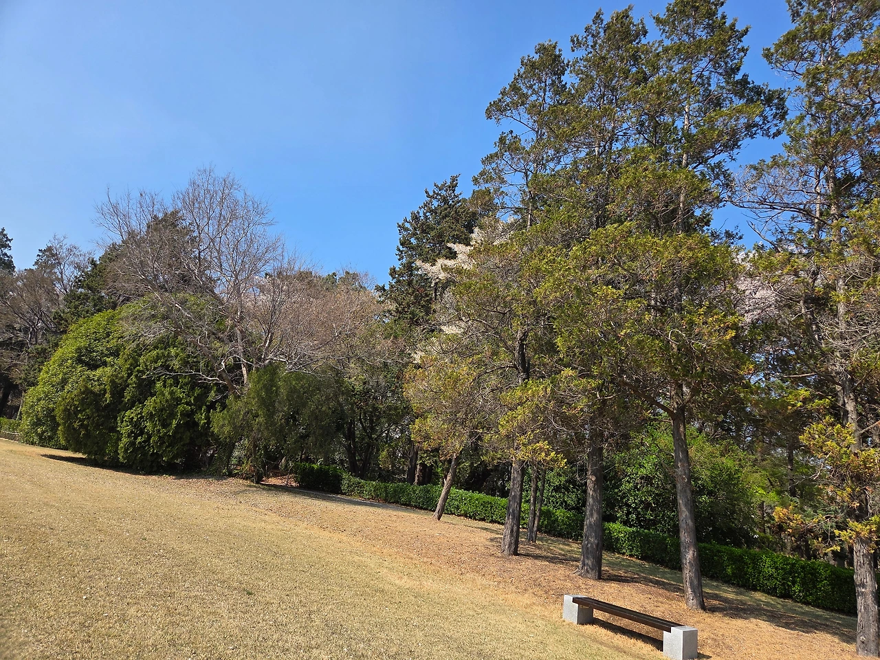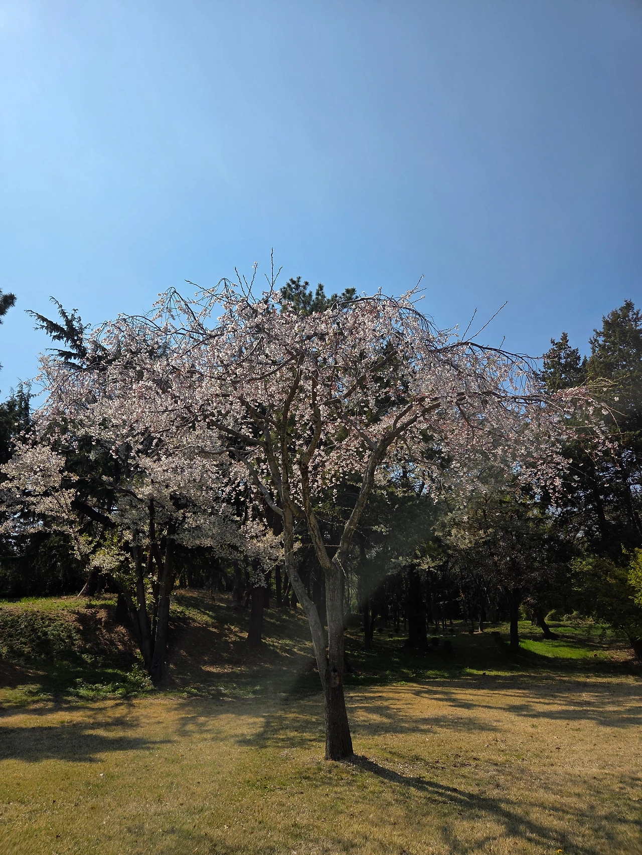 작은 호수를 지나 공원 후문 근처로 가니, 최근 개방된 잔디 위에 벚꽃이 한창이다. 고개를 들어 올려다보면 아직은 풍성하지만, 봄바람이 스칠 때마다 꽃잎이 하나둘 내려앉는다.