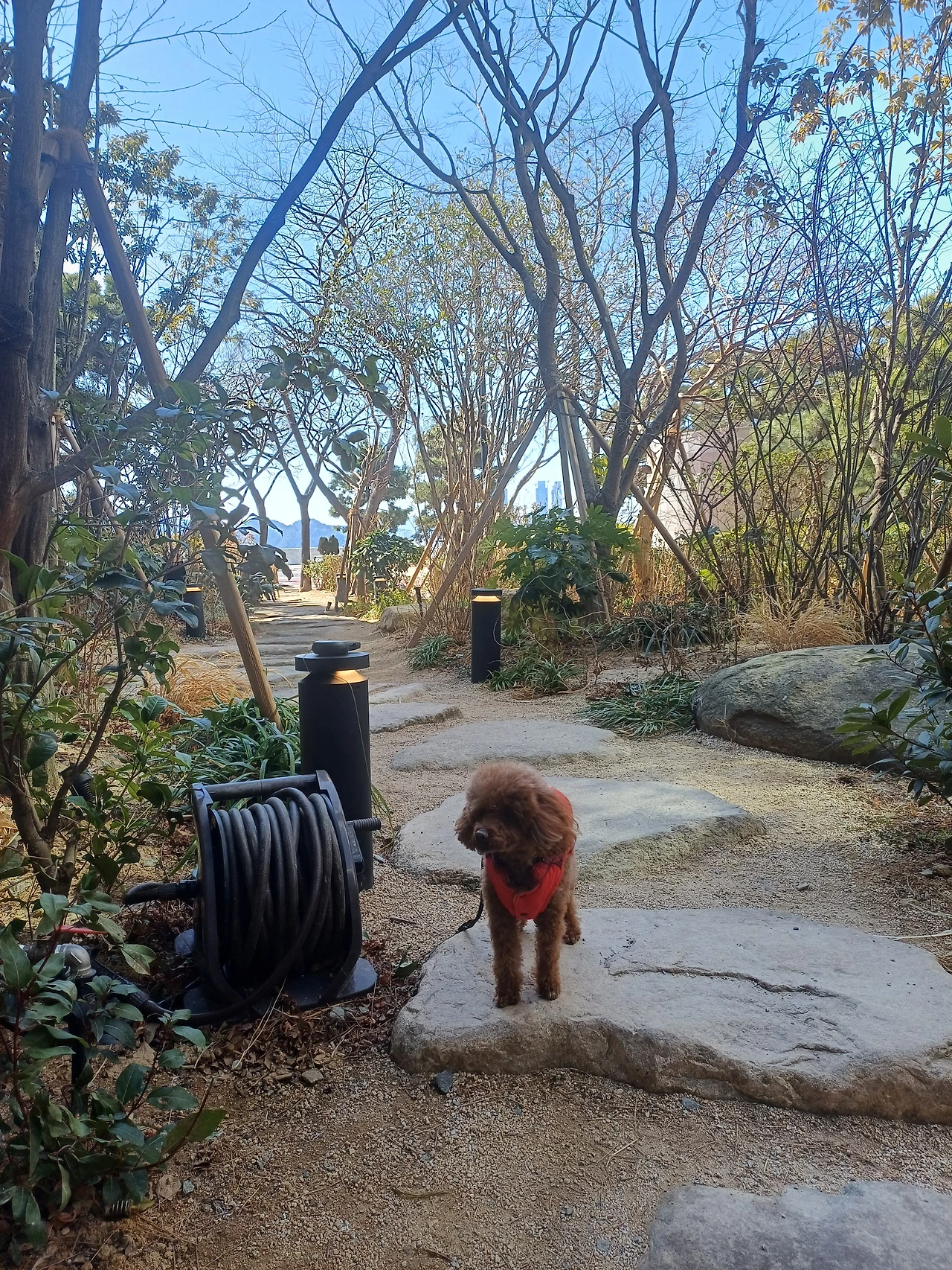 커피 집 앞엔 애완용 반려견이 아직 추운지 빨간 옷을 입고 카페 내에서 커피를 마시고 있는 주인이 언제 나올지 고개를 꼿꼿이 하고 기다리고 있다. 서울에 있는 우리 히꼬가 생각이 나서 그 모습을 찍었다.
