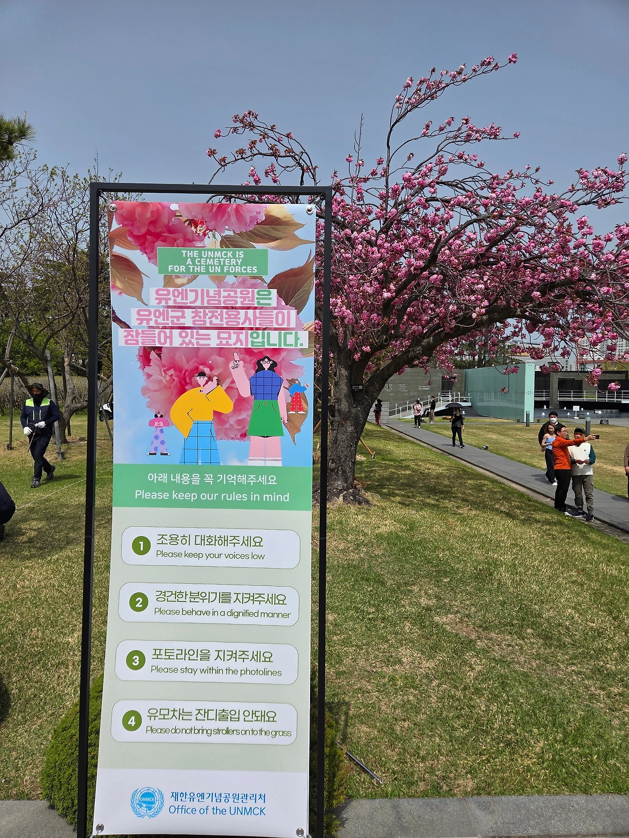 누구나 사진을 찍고 싶어 하는 '유엔 추모명비'(한국전 유엔군 전사자 4.1만 명의 이름이 새겨진 곳)를 뒷배경으로 두고 서있는 곁벚꽃 나무 군락은 너무도 예쁘지만, 더 이쁘게 나오려고 난간에 앉는 것은 물론, 아찔하게도 난간 위에 서서 사진을 찍는 연인들이 많아 위험하다고 이곳서 오래 일한 직원들이 이구동성으로 말한다. 또 내가 며칠 전 지나가다 보니 몰래 난간에 서서 사진을 찍는 분들을 실제로 보았다. 1.5미터는 족히 되는 아래로 떨어지면 큰 사고가 날지도 싶다.