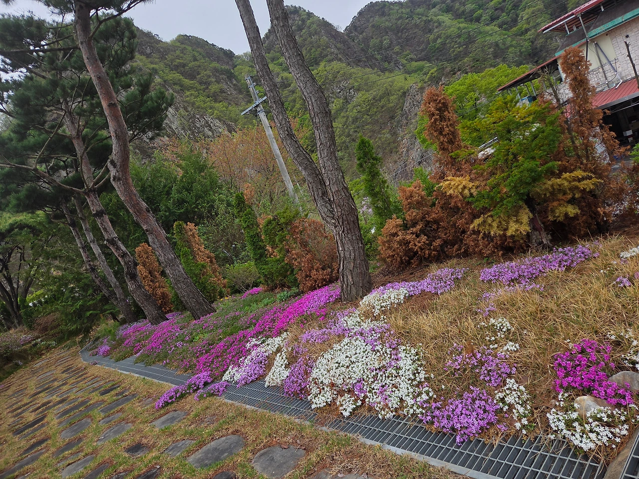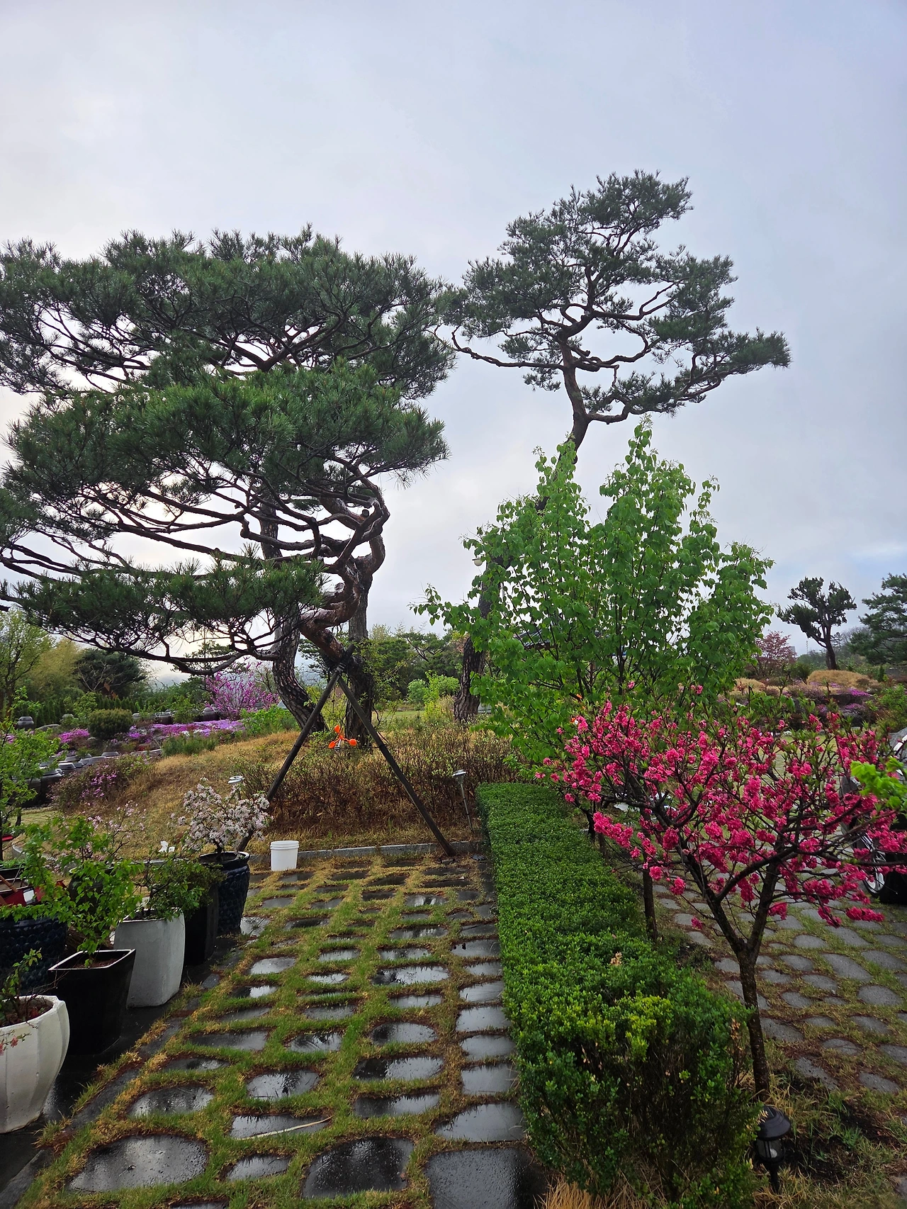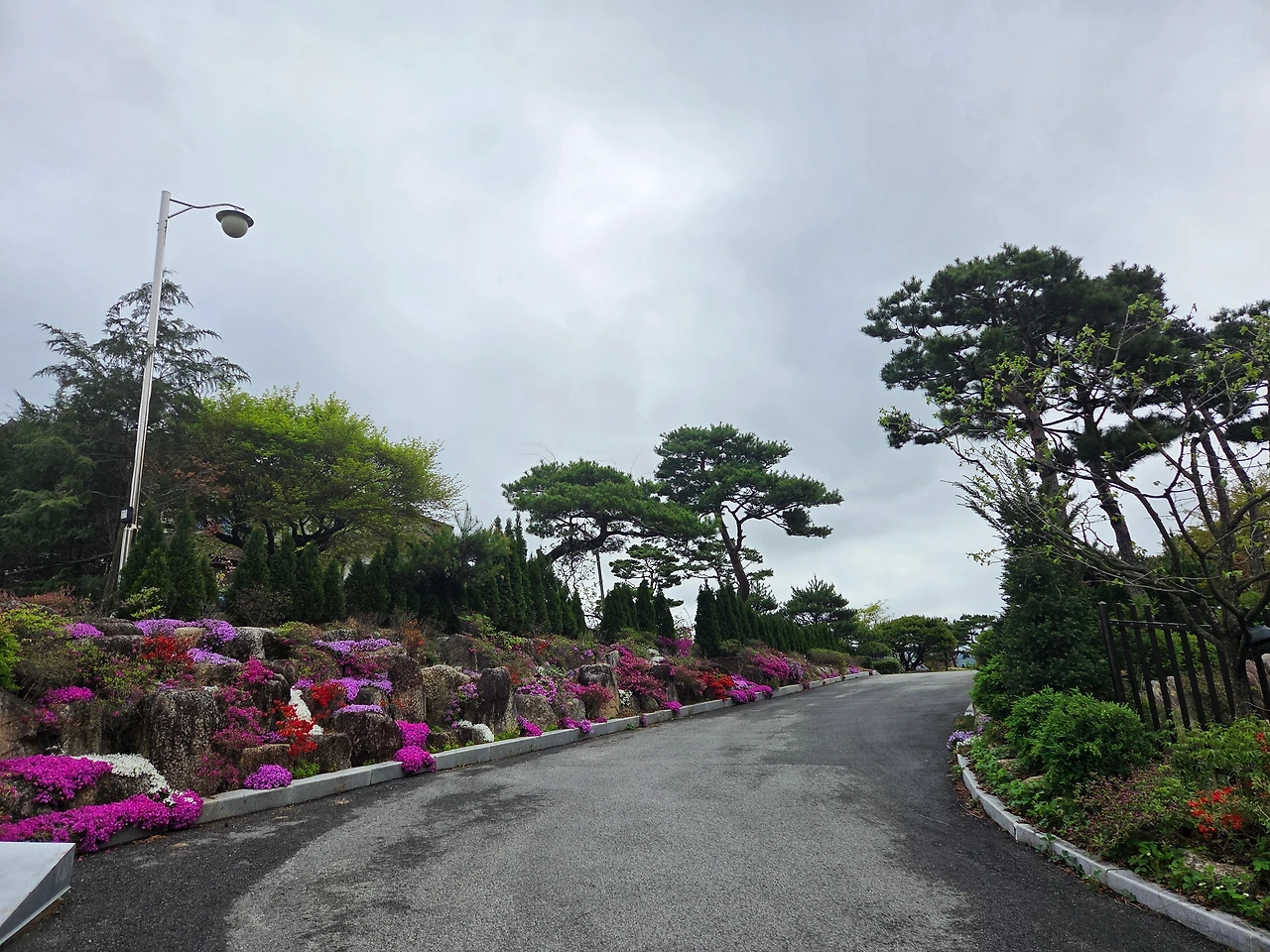 멋진 소나무, 영산홍, 목련, 라일락, 개나리, 복숭아 봄 꽃이란 봄 꽃은 여기저기 다 있다.