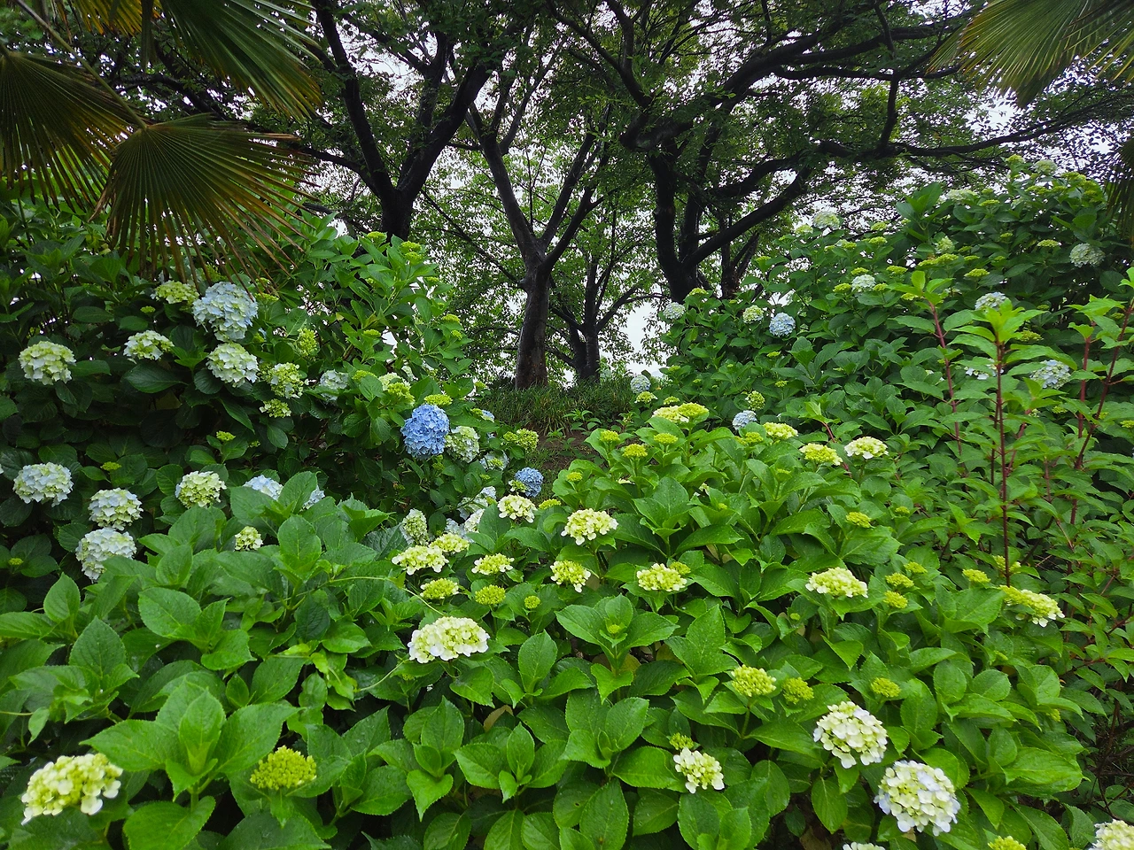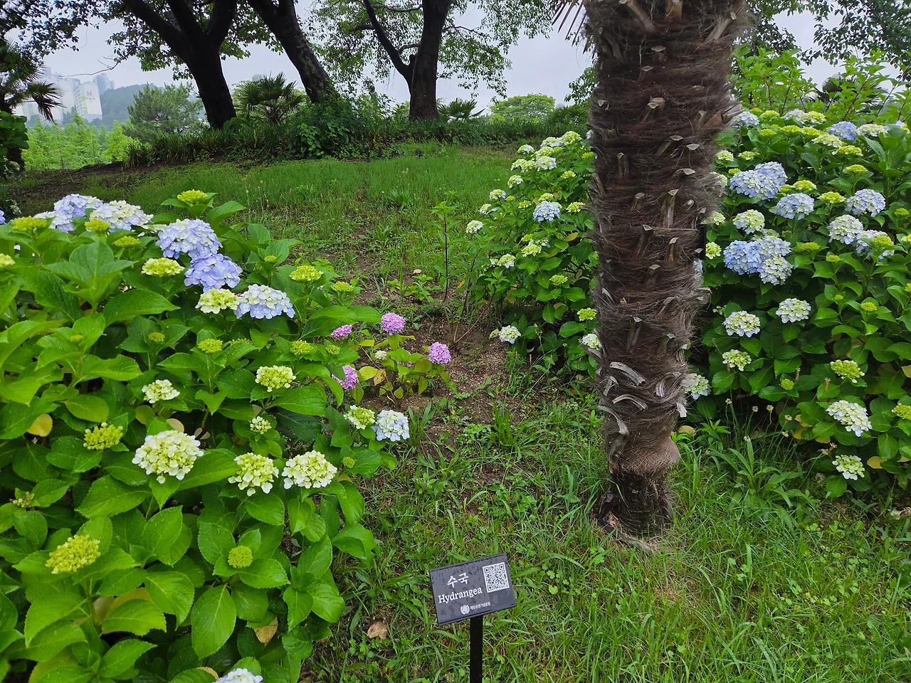 한태 우정의 다리로 연결된 작은 동산의 수국