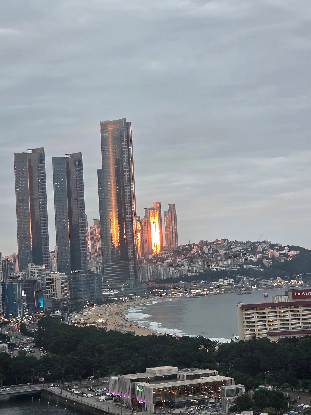 해질 녁 해운대 달맞이 언덕의 고층 빌딩에 비췬 낙조