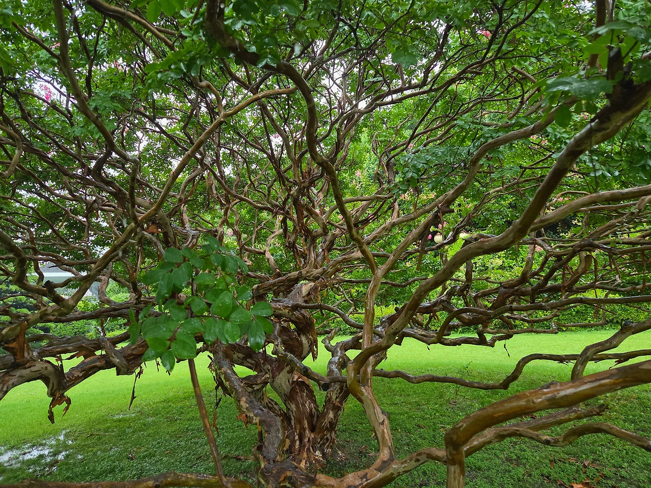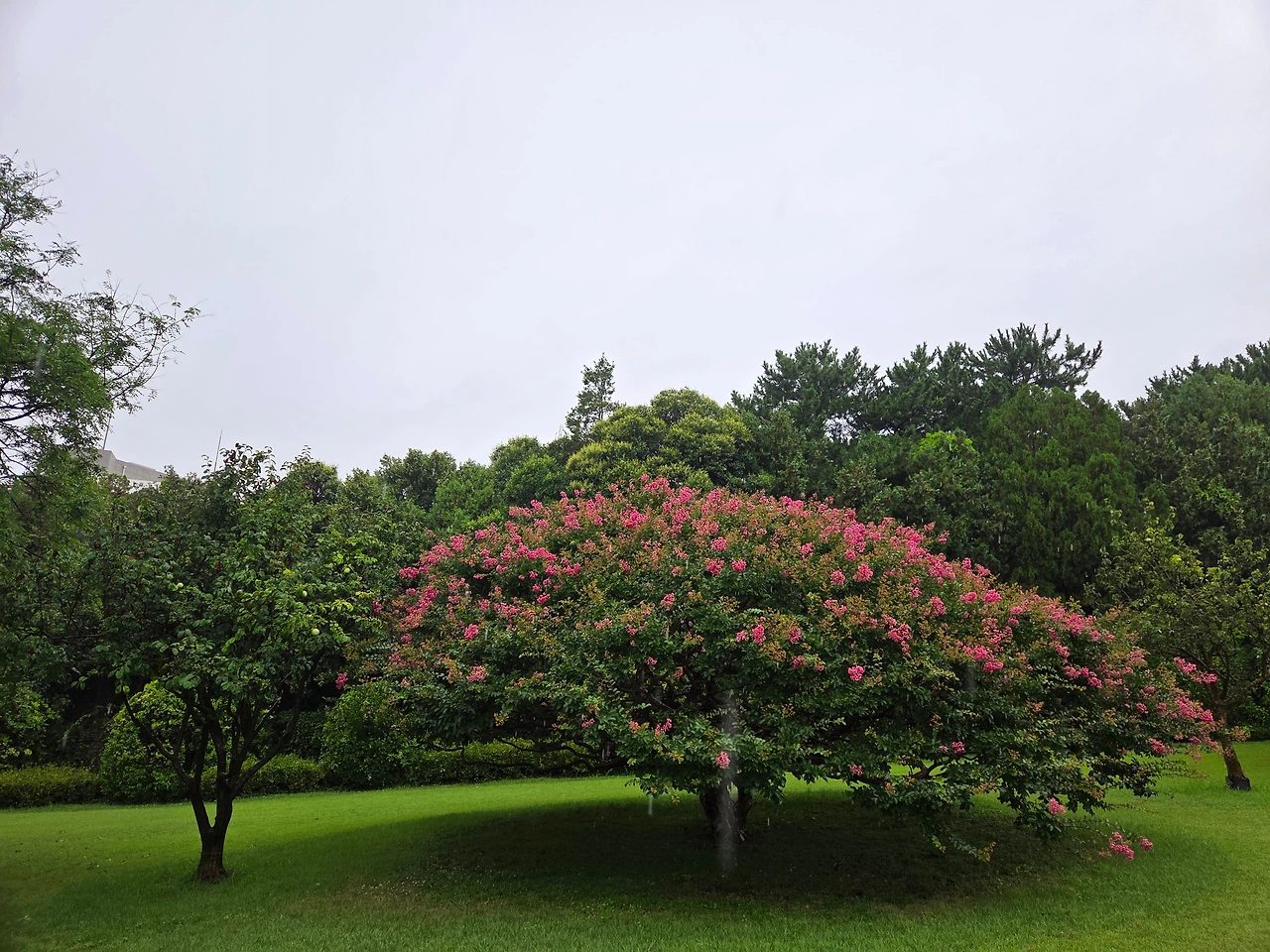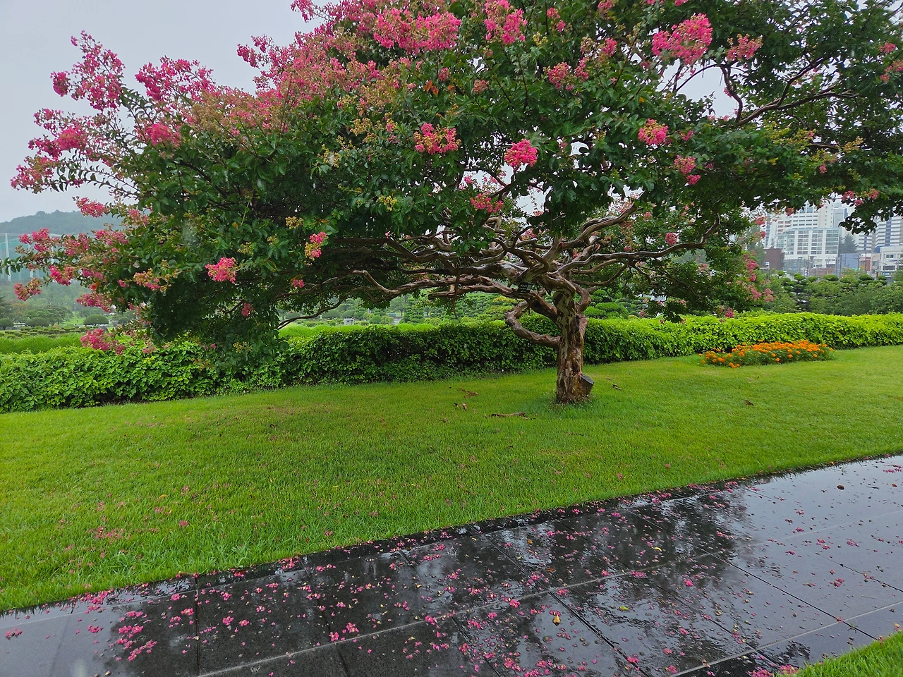 여름 꽃하면 뭐니 뭐니 해도 배롱나무 꽃이다. 7월부터 피기 시작한 연분홍 꽃이 만개하고 있다. 비 오는 아침 묘지를 우산(최근 유엔묘지 마크가 있는 8천 원짜리 우산 겸 양산 출시)을 쓰고 걸으면 세어보니 묘지 내 10여 그루가 있는데 몇십 년은 된 노목이다. 꽃도 꽃이지만 그 형태가 마른모꼴이고, 도사 지팡이처럼 꼬불꼬불한 나무 가지에 내려앉은 비로 촉촉해진 모습을 보니 화창한 날의 메마른 가지 때와는 달리 새로운 감성을 자아낸다.
