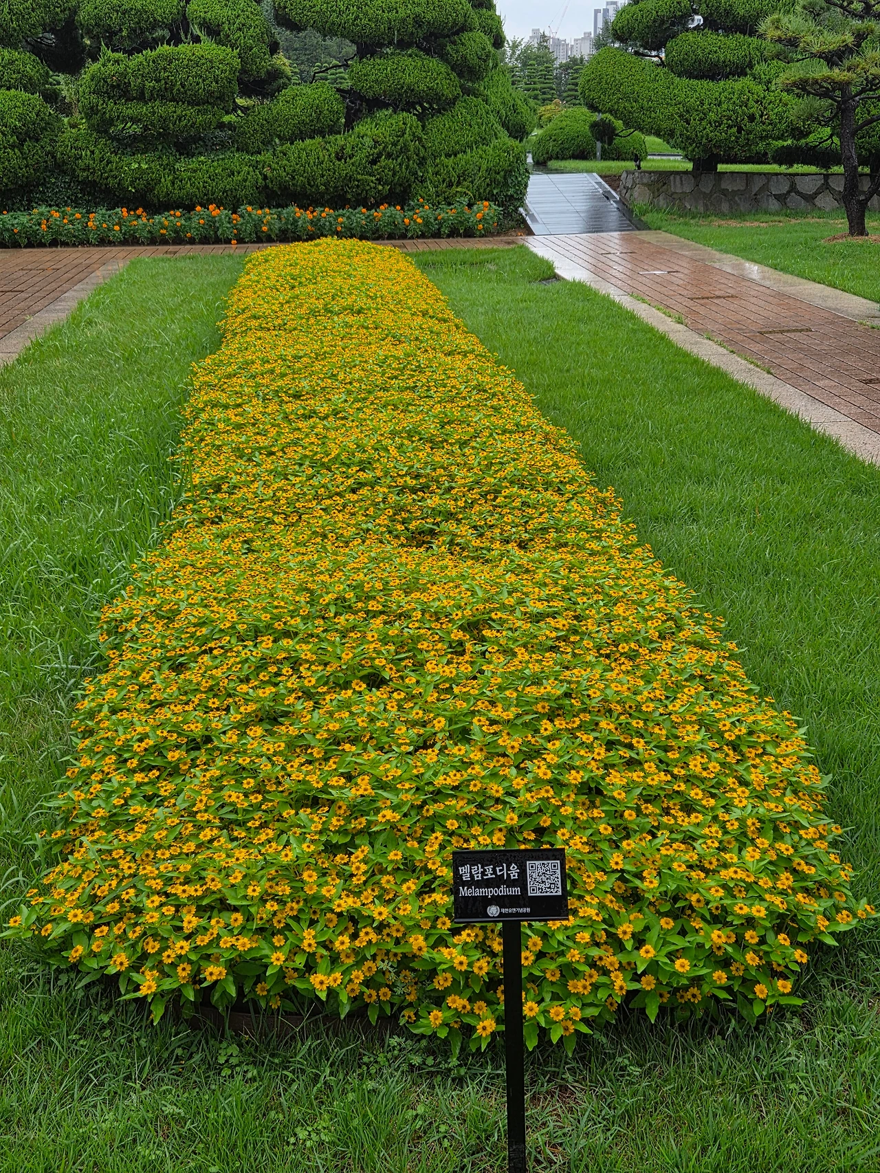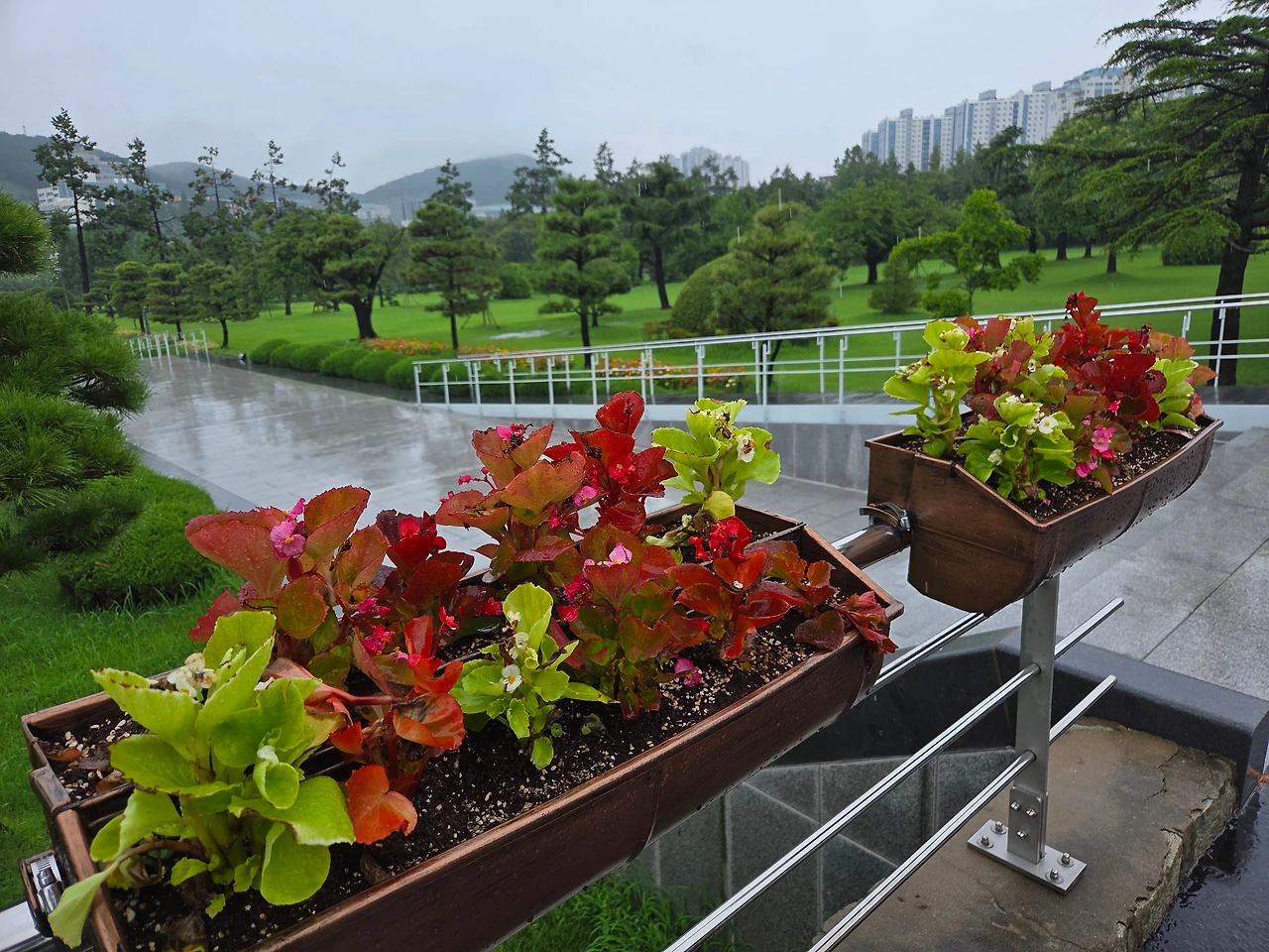 유엔묘지의 여름 제철 꽃들이 비에 흠뻑 맞아 싱싱하다. 폭염에 하루 오전 오후로 스프링클러로 40톤의 지하수로 물 주기를 하지만 부족한데 8월 비가 내린다.