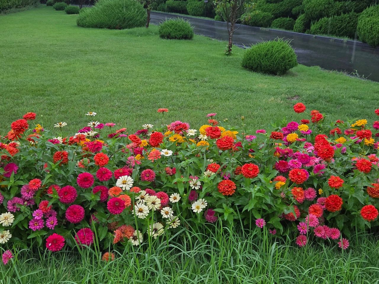 백일홍은 봄여름가을에 심는 유엔묘지의 단골손님이다. 하얀색, 연분혹색, 노란색의 갖가지 색으로 풍성하게 핀 백일홍 꽃도 비에 흠뻑 젖어 생기가 넘친다.