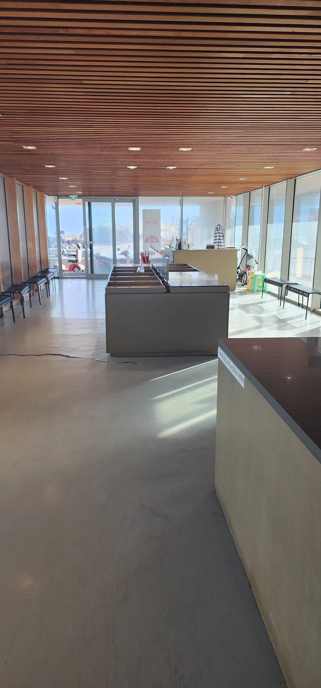 지금은 연말에다 겨울이기도하고, 하도 날씨의 변덕이 심해서 하루 걸러 하루 일하는 장소가 되었지만, 이제 곧 봄이 되면 나도 초보티를 벗을 것이고, 이곳 터미널도 관광객으로 북적될 것이다. 이 터미널은 가파도의 면적이나 200여 명 되는 인구에 비해 큰 편이다. 물론 원주민만을 위한 장소가 아니라 관광객의 숫자를 생각하면 그렇게 크다고 말할 수는 없겠다. 주변 환경에 어울리도록 예술적으로 낮게 지어져서 가파도에 들어오며 마음을 편하게 한다. 내부는 대략 100평 정도는 되고, 화장실은 모두 비데가 설치되어 있으며, 냉난방이 확실하고, 비바람, 눈보라에도 끄덕 없는 견고함을 유지한다. 비바람이 몹시 불던 날도, 문을 닫고 안에 들어와 있으면 조용하여 외부로부터 완벽하게 차단된 느낌이다.