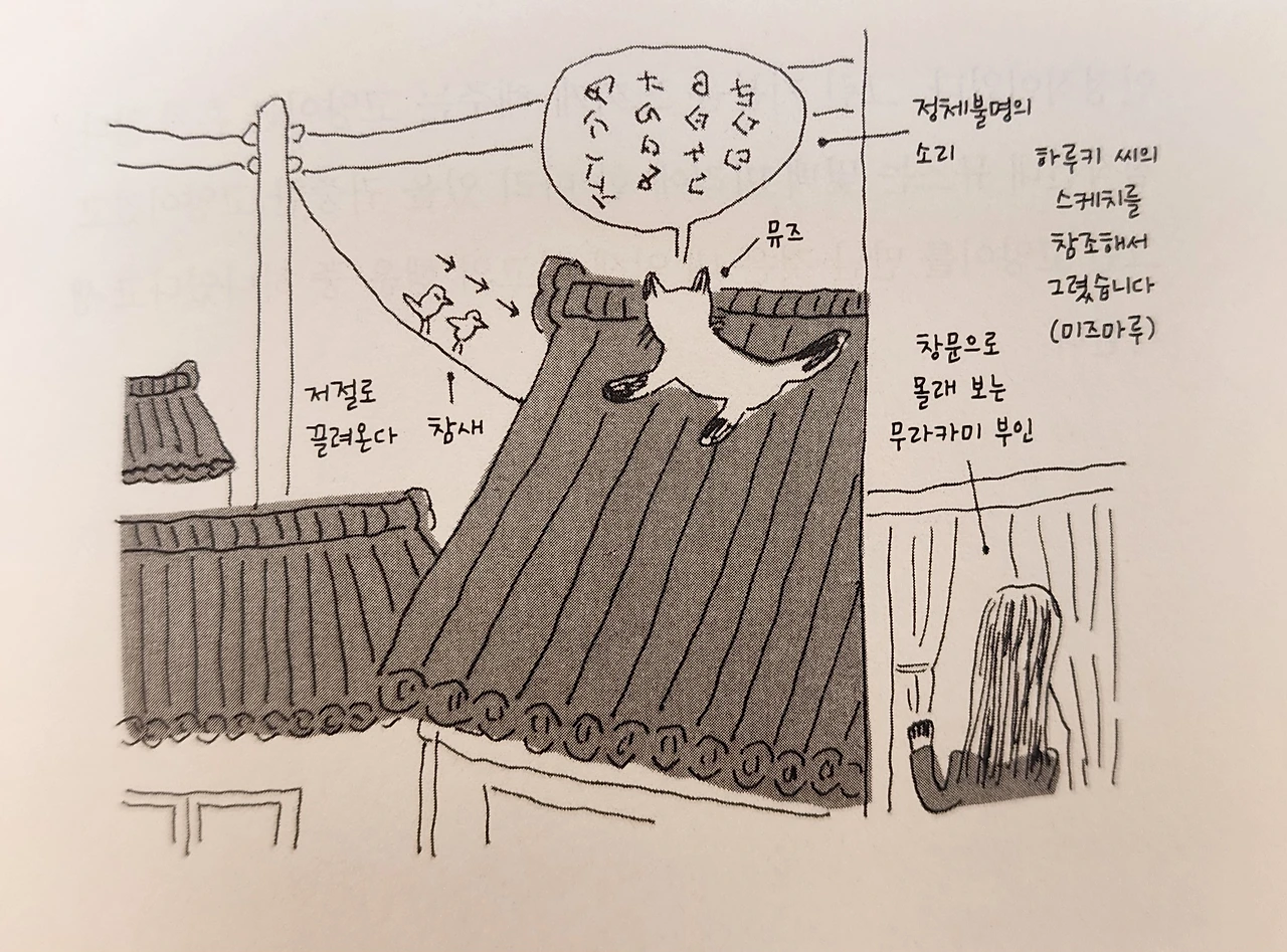 "고양이는 눈을 뜨고 내 얼굴을 힐끔 보더니, 묻는 말에는 아무 대꾸 없이 크게 하품을 하고 기지개를 켠 다음, '이 인간이 대체 뭐라는 거야?' 하듯이 이불에서 나와 고개를 저으면서 어딘가로 가버렸다. 그때 나는 '이 고양이는 분명히 뭔가 감추고 있다'는 강한 느낌을 받았다. 고양이가 자신의 중요한 비밀을 무심코 사람한테 들켰고, 그것을 대충 얼버무리려는 것처럼 보였다. 녀석은 사실 말을 할 줄 알지만 알려지면 귀찮으니까 교묘히 능력을 감추고 사는 게 아닐까 진지하게 생각했을 정도다. 어쩌면 정말로 그런지도 모르지만.